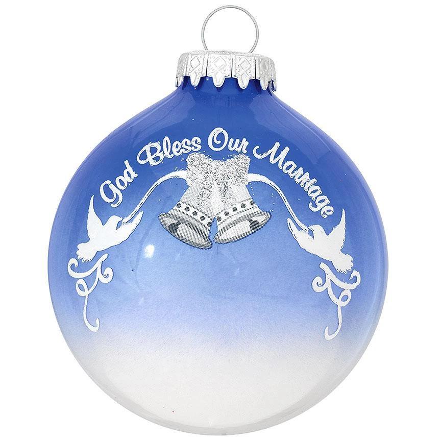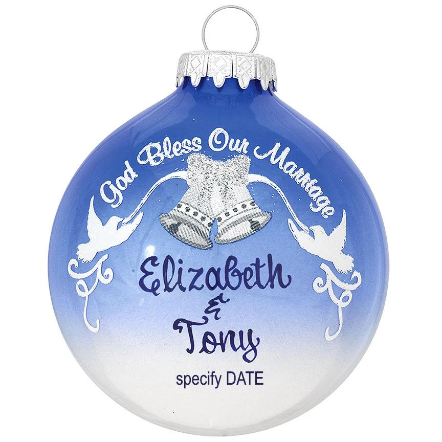 Wedding bells joyfully announce the union of a special couple in this exquisite design! Our three-tone blue, light blue and opal ornament features the sentiment God Bless Our Marriage in flowing white script above the elegant image of wedding bells and doves linked together by a band of white ribbon. Crafted of glass in Hungary exclusively for Bronner’s, this striking 3″ tall god bless our marriage dove and bells ornament will make a great wedding gift. Allow one of our talented Bronner’s artists to hand-paint a personalized touch with vivid blue paint at no additional charge.