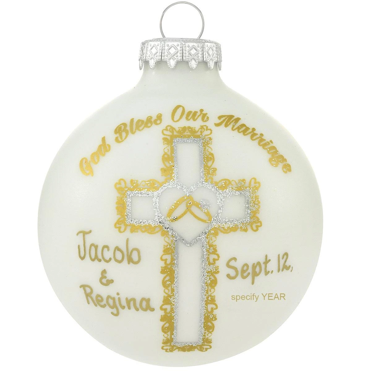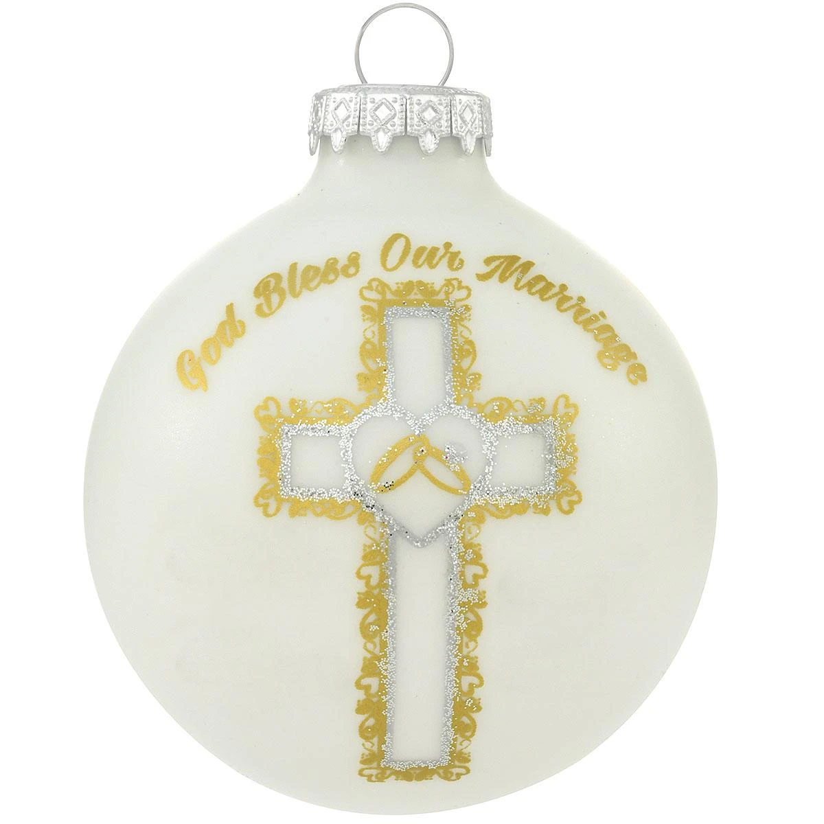 A cross adorned with a heart and wedding rings decorates this shimmering white ornament along with the sentiment God Bless Our Marriage. Accented with gold glazes and touches of sparkling silver glitter, this 3″ Bronner’s exclusive design is skillfully crafted of glass in Hungary and makes a wonderful wedding gift for your special couple! Allow one of our talented Bronner’s artists to add a touch of personalization using a gold paint pen at no additional charge.