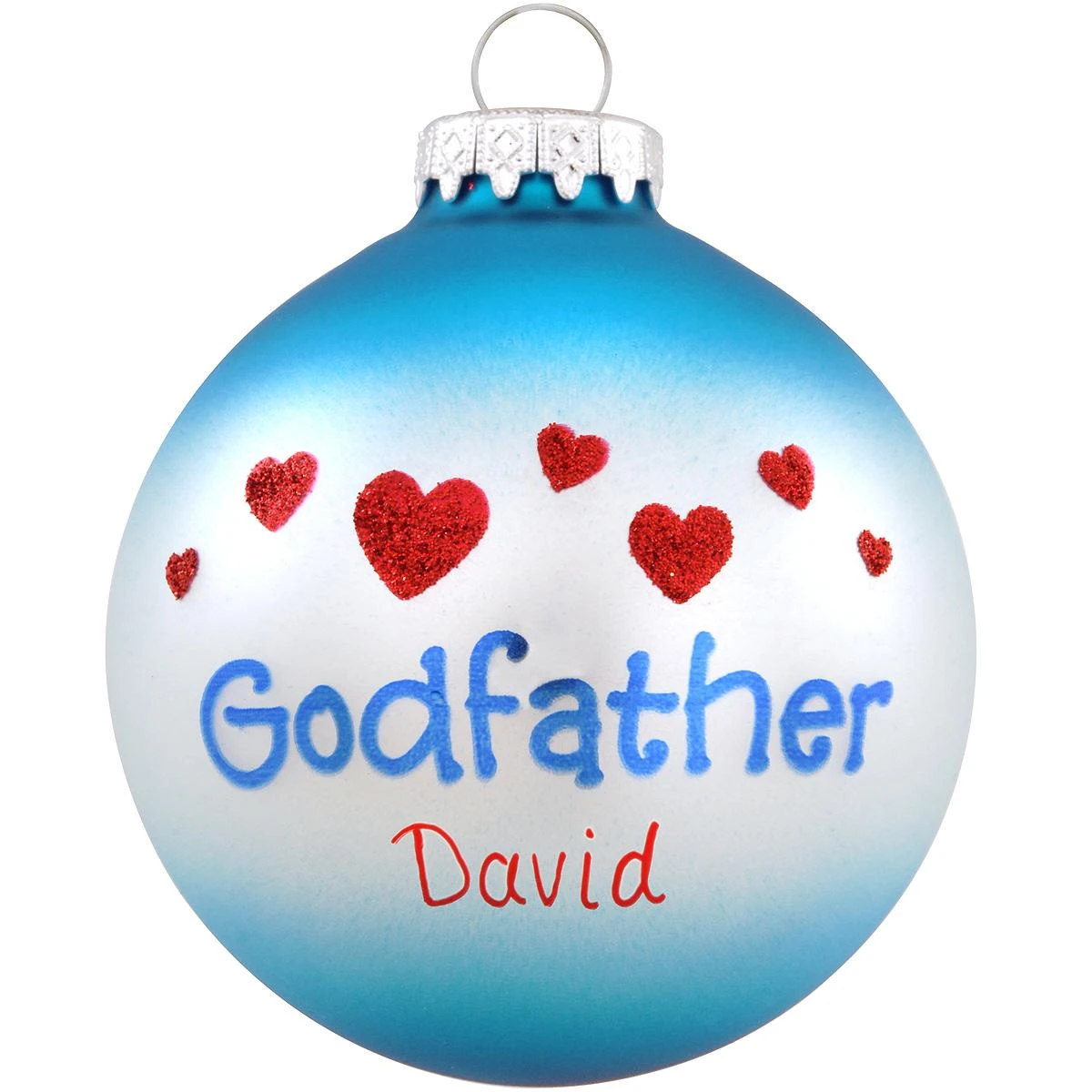 This loving sentiment is the perfect gift for a special godfather! Artfully crafted in Hungary exclusively for Bronner’s, this charming 3″ round personalized godfather glass ornament features a two-tone blue and white satin surface embellished with a pattern of glittery red hearts above the designation Godfather. Allow one of our professional Bronner’s artists to add a personalized touch with a red paint pen at no additional charge to this unique family ornament with hearts.