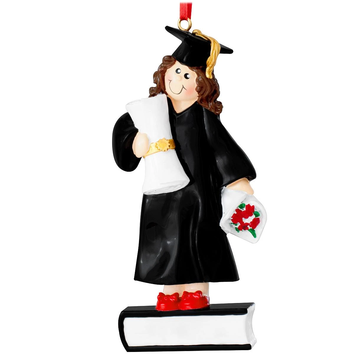 Diploma and flower bouquet in hand, this special graduate is ready to step from the podium into a promising future! Artfully crafted of resin, our 4½” tall personalized graduate girl figure ornament is vividly painted in charming detail. Allow one of our talented Bronner’s artists to add a personalized touch with a black paint pen at no additional charge. The graduate on your gift list is sure to appreciate this award winning gift idea! Please select the alternate image for a view of this ornament without personalization.