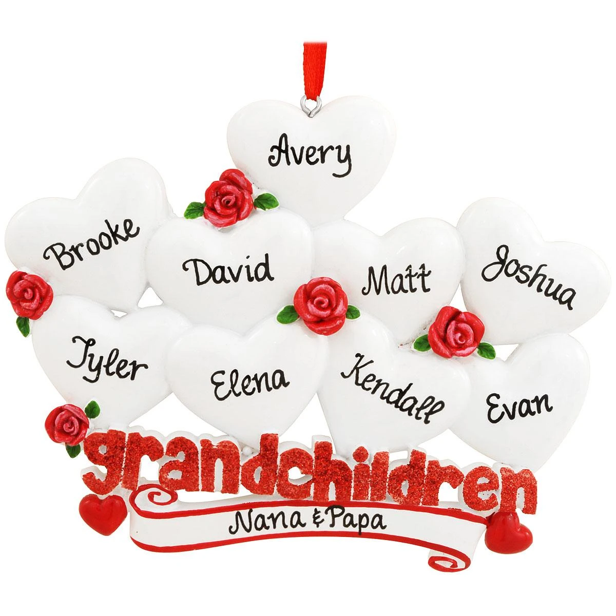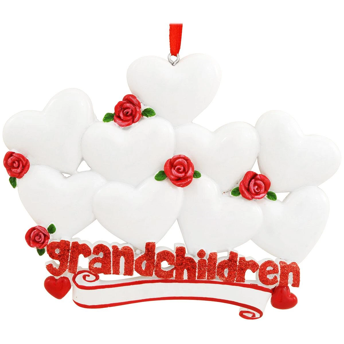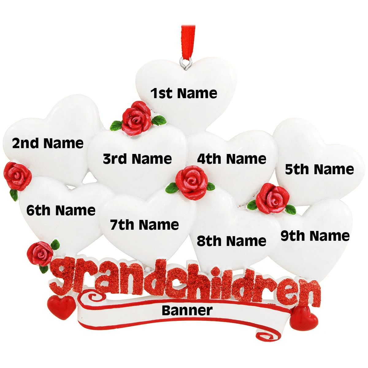 Whether a gift from grandchildren to grandparent, or the other way around, our heart-felt gift makes a loving statement. Artfully crafted of resin, this 4¼” tall by 5½” wide ornament features a heart and rose motif and the sentiment grandchildren spelled out in sparkling red glitter. Coming ready to hang with a red ribbon, our grandchildren with 9 hearts ornament can be personalized by one of our talented Bronner’s artists with a black paint pen at no additional charge. What better way to let loved ones know that their names are written on your heart?!