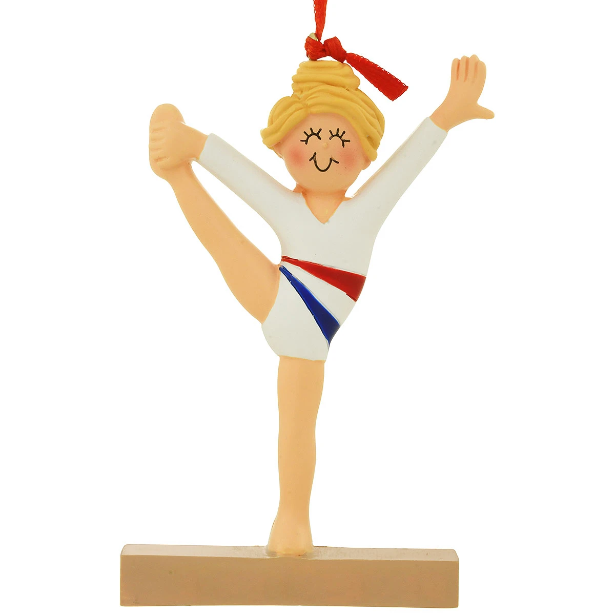 Strike the perfect balance with the gymnast in your life with this unique personalized gift! She’ll flip over our energetic design showing a smiling girl with blonde hair balancing on one foot with arms raised and one foot held in the air. Crafted of resin with vivid glazes of white, red, and blue, our gymnast child ornament measures 3¾” tall and comes ready to hang on a red cord.Â