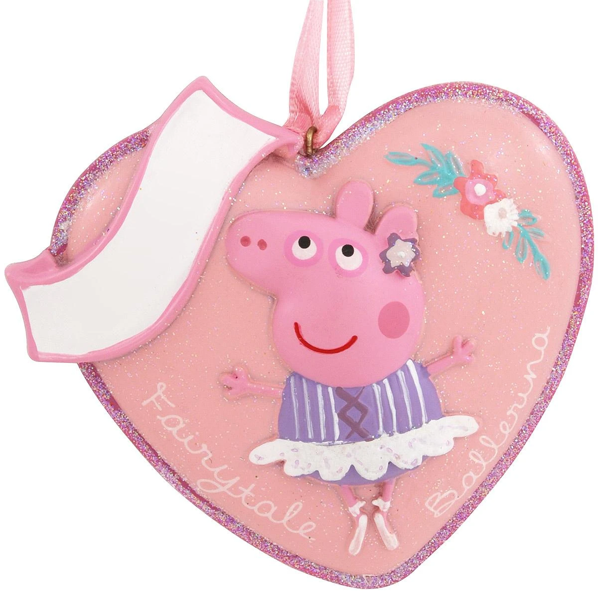 Surprise your young Peppa Pig™ fan with this cute heart shaped ornament! Pretty in pink, our 3″ tall keepsake is artfully crafted of resin and depicts the popular cartoon character on her toes in a vivid purple tutu. Complete with the sentiment Fairytale Ballerina, this charming keepsake comes ready to hang with a pink ribbon and can be personalized by one of our talented Bronner’s artists with a purple paint pen at no additional charge.