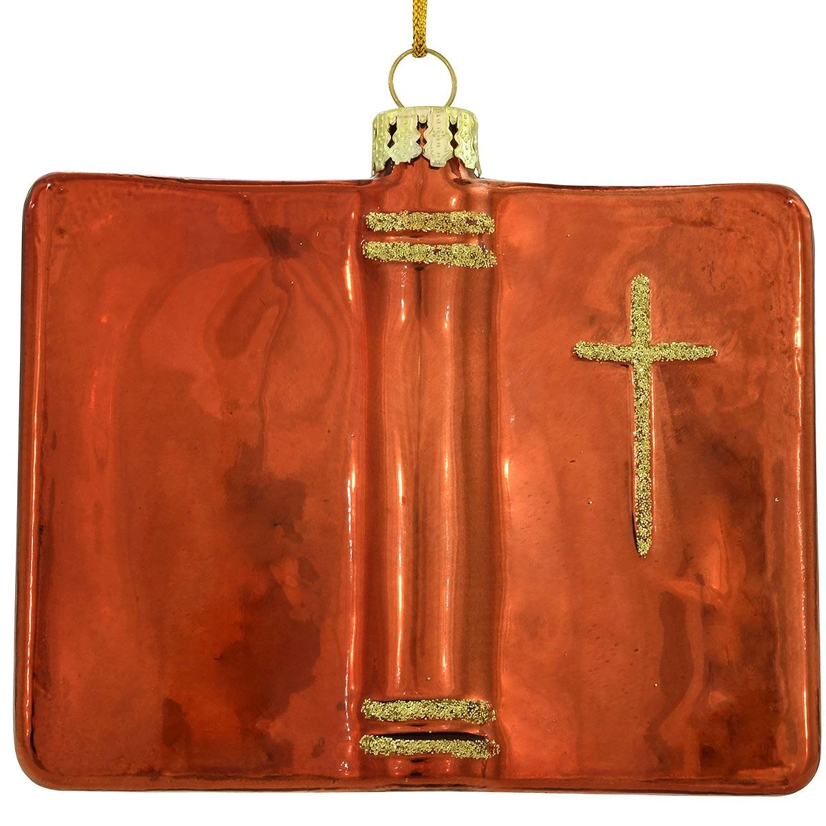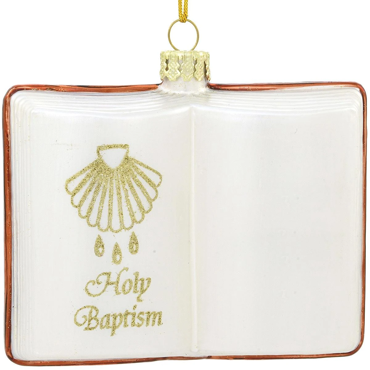Commemorate the special occasion of a loved one’s Holy Baptism with this beautiful keepsake gift. Artfully crafted in glass exclusively for Bronner’s, our sculpted book form ornament depicts an open Bible adorned with a seashell and three drops of water above the sentiment Holy Baptism. Gleaming with opalescent white glazes and gold glitter accents, this handsome ornament measures 3″ tall x 3½” wide and comes ready to hang on a gold cord. The reverse side has a shiny copper finish embellished with a sparkling gold cross. Allow one of our professional Bronner’s artists to hand-paint a personalized touch in glistening gold paint at no additional charge.