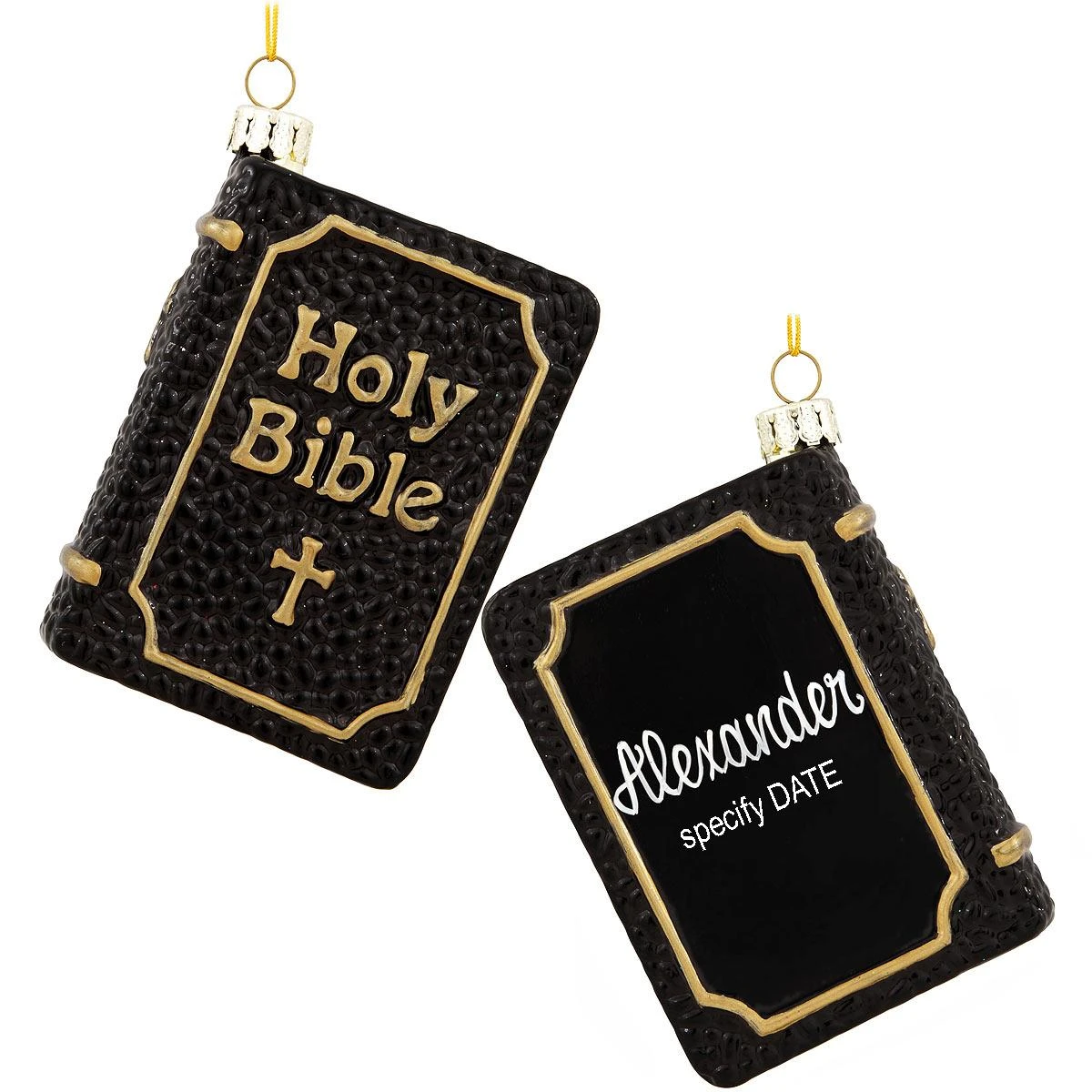 Our glass version of the greatest book ever written gleams from cover to cover with glossy ebony glazes, glistening gold accents and a unique light-reflecting texture. An ideal gift for a baptism, confirmation, wedding, or other memorable occasion, our exclusive black Holy Bible ornament measures 4″ tall and comes ready to hang with a gold cord. Allow one of our professional Bronner’s artists to hand-paint a personalized touch in vivid white paint at no additional charge!