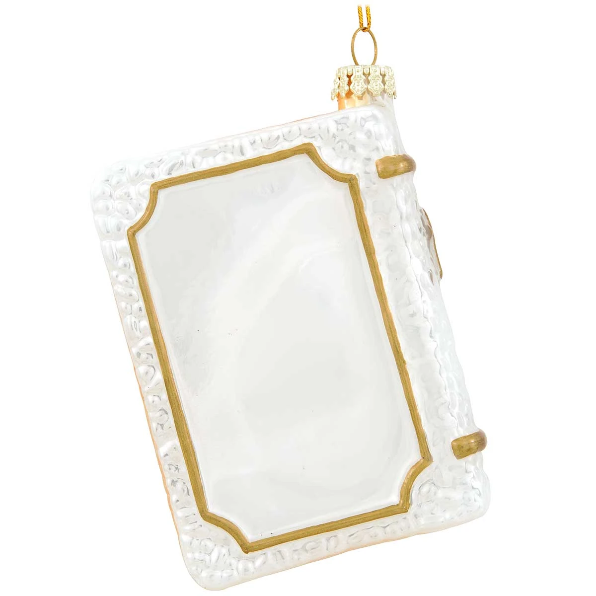 Our glass version of the greatest book ever written gleams from cover to cover with pearly white glazes, glistening gold accents and a unique light-reflecting texture. An ideal gift for a baptism, confirmation, wedding, or other memorable occasion, our exclusive white Holy Bible ornament measures 4″ tall and comes ready to hang with a gold cord.
