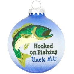A great catch for the fisherman on your list, this Bronner’s exclusive design features the sentiment Hooked on Fishing below an impressive bass glistening with green glitter accents. Our attractive 3″ round ornament is artfully hand-crafted in Hungary with a semi-transparent finish in two-tones of blue and textured on the inside with a “splashing water” effect. Allow one of our talented Bronner’s artists to personalize this a-lure-ing keepsake with a navy blue paint pen at no additional charge.