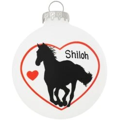 Giddy on up! This beautiful 3″ tall glass ornament will make the perfect gift for that special horse lover on your list! A frosted ornament shows the majestic silhouette of a galloping horse in the outline of a red heart. Allow one of our professional Bronner’s artists to add a personal touch with a black paint pen at no additional charge. Stop horsing around and make sure this personalized horse heart silhouette ornament is able to trot on the branches of your tree this year!