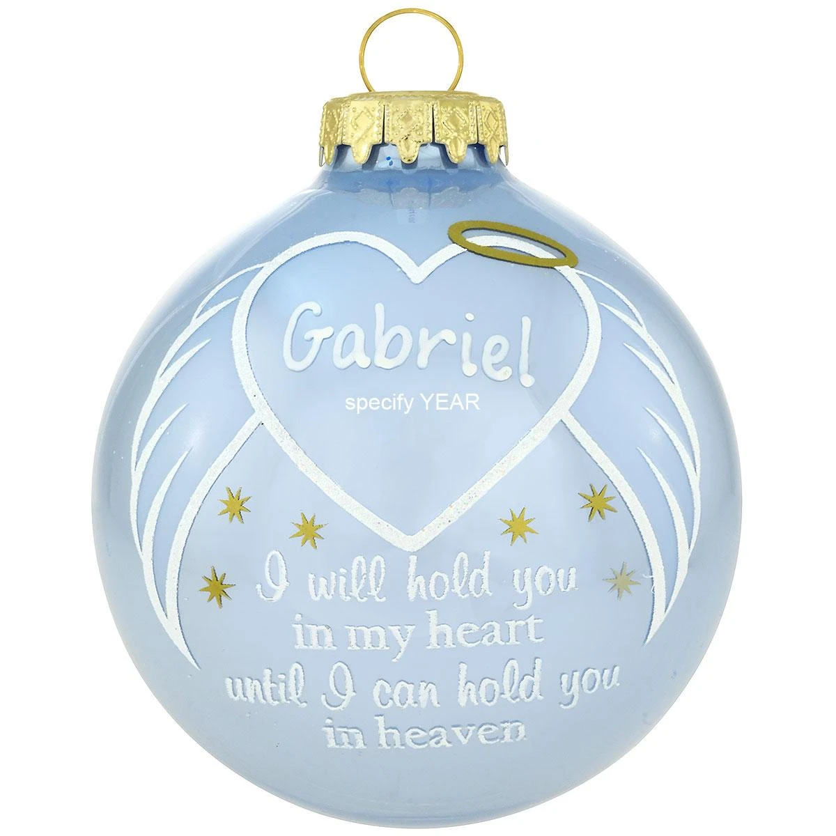 Losing a loved one is one of life’s most unimaginable pains; preserving their memory provides a small comfort! Our heartwarming design features a heart with wings and halo above the sentiment “I will hold you in my heart until I can hold you in heaven”. Exclusively crafted from glass in Hungary for Bronner’s, our 3″ round blue opalescent ornament can be personalized by one of our talented artists with a white paint pen at no additional charge to honor your loved one.
