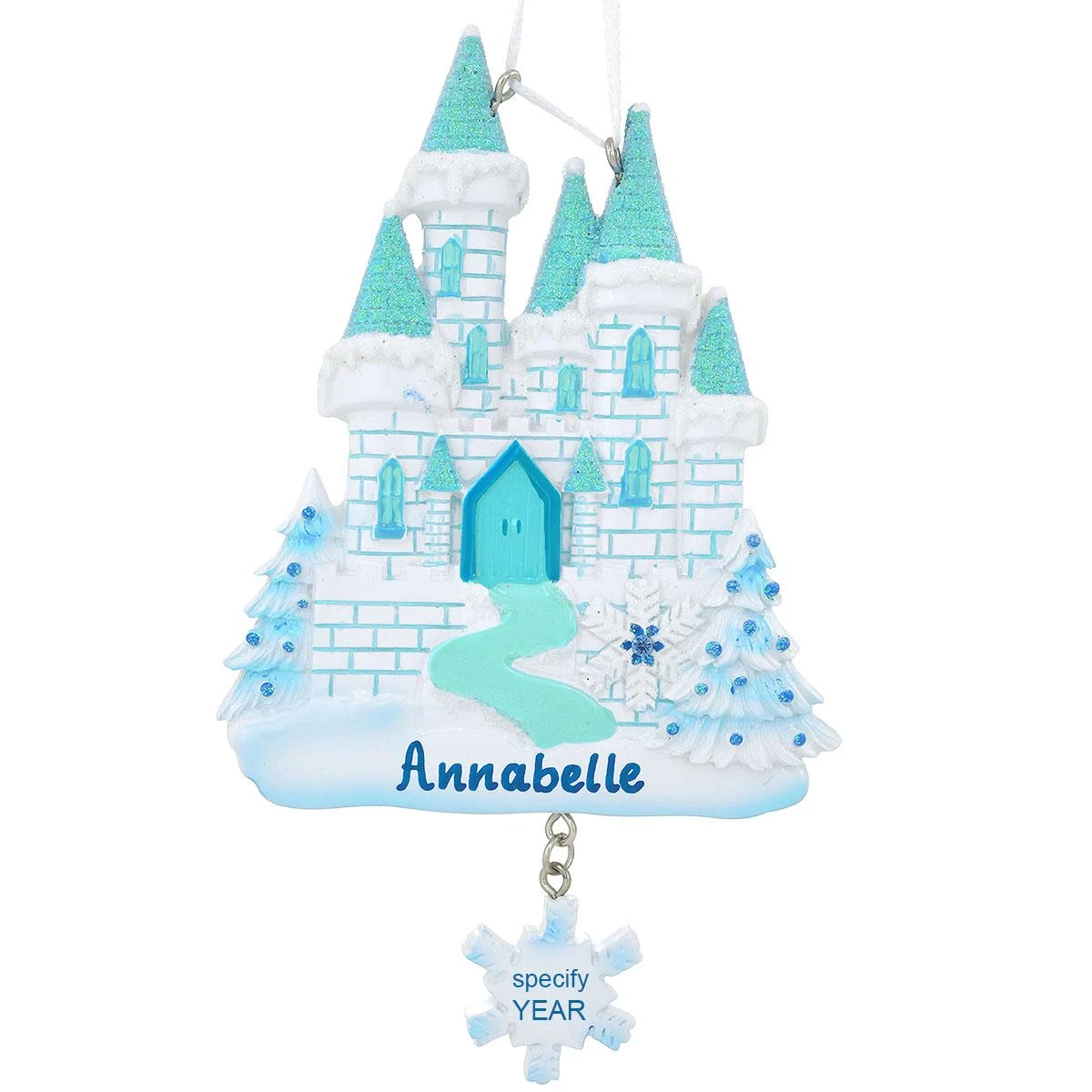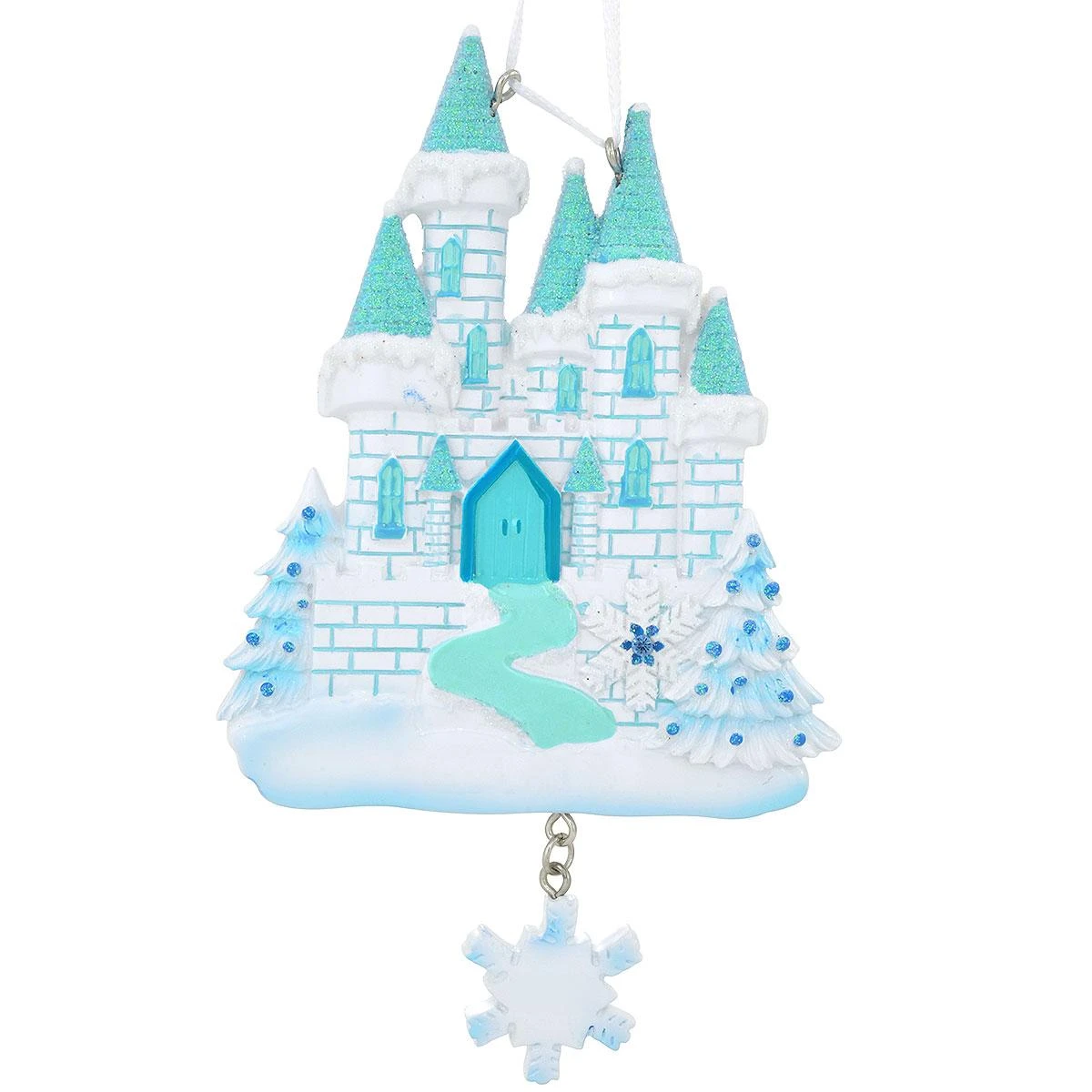 Fit for a princess, this enchanting ice castle shimmers with a frozen charm she’s sure to love for years to come! Beautifully crafted of resin, our 6″ tall ornament is hand-painted in icy hues of white and blue with touches of iridescent glitter. Adorned with a dangling snowflake charm, this cool keepsake comes ready to hang with a white ribbon and is sure to add a touch of magic to the tree. For a gift with true personal-ityâ„¢, why not allow one of our talented Bronner’s artists to add your princess’ name in vibrant blue paint pen at no additional charge?