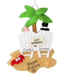 You can still feel the sand between your toes! Rekindle the excitement of your honeymoon or beach wedding each and every year with this delightful just married beach ornament! Measuring 4¾” tall and crafted of resin, our just married beach ornament comes ready to hang with a satin white ribbon. Newlyweds are sure to grow frond of this keepsake which features two beach chairs, a groom’s top hat, a bride’s pink bouquet, a patch of sandy beach beneath a colorful palm tree, a starfish and adorable red crab and a tiny sign which reads, Just Married. Allow one of our professional Bronner’s artists to add a personalized touch with a black paint pen at no additional charge. Relive the memories of sharing a tropical paradise for Christmases to come as you hang our unique keepsake on the tree!