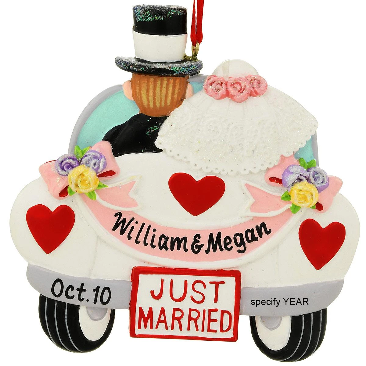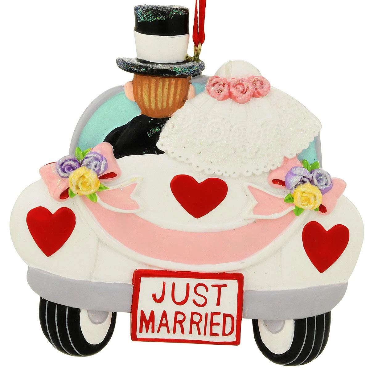 A kiss for luck and the happy couple are on their way! Just starting out on the journey of marriage, our bride and groom drive off side by side in a classic convertible decorated with hearts, flowers, and “Just Married” license plate. Artfully crafted of resin, our just married couple in car with flowers ornament is hand painted with a myriad of vibrant glazes and sparkling glitter accents and comes ready to hang with a red ribbon. For an extra special gift, allow one of our talented Bronner’s artists to add personalization to this lovely 3½” tall keepsake with a black paint pen at no additional charge!