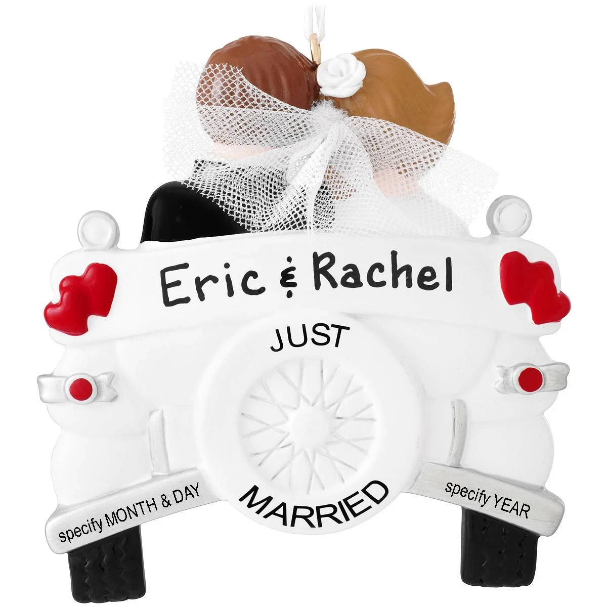 No clanging cans tied to the bumper, simply a “Just Married” declaration as the happy couple drive off into the sunset! Artfully crafted of resin, this 3½” tall just married wedding car ornament is painted with vivid glazes and whimsically adorned with a bridal veil made of white tulle. Coming ready to hang with a white ribbon, this charming ornament can be personalized by one of our talented Bronner’s artists with a black paint pen at no additional charge. A great gift idea for the special couple in your life who are just married or are soon to be Mr. and Mrs!