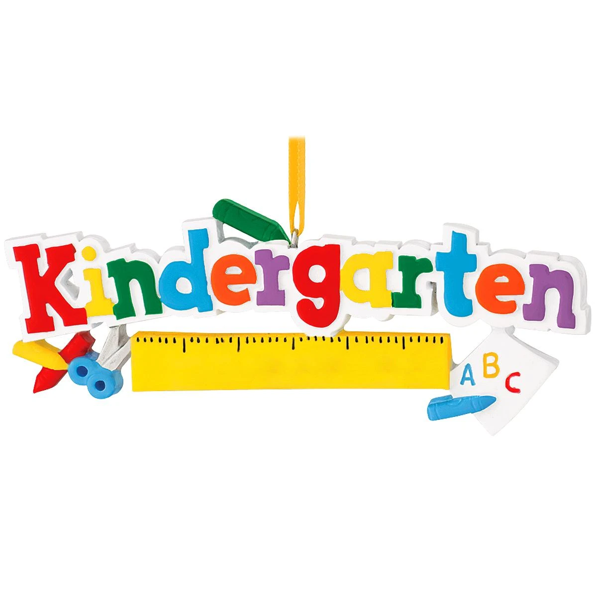 Your kindergartener has learned so much this year that you can practically measure the progress on a ruler! Why not celebrate this unique school year with our personalized kindergarten ruler ornament? Artfully crafted of resin, this special keepsake features the grade designation Kindergarten colorfully spelled out above a ruler, notebook, scissors, and crayons. Our cute 1¼” tall x 4½” wide ornament comes ready to hang with a yellow ribbon and can be personalized by one of our talented Bronner’s artists with a black paint pen at no additional charge.