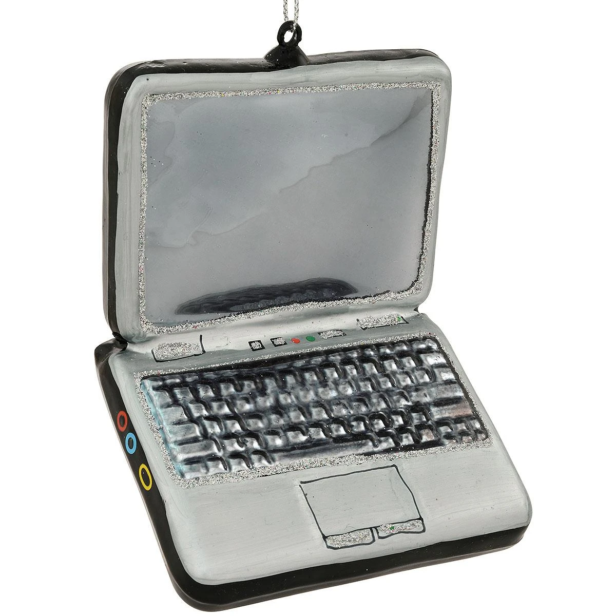 Download our 4¼” tall by 3¼” wide laptop computer ornament to your tree for high-tech festive fun! Artfully crafted of glass and coming ready to hang with a silver cord, this charming Bronner’s exclusive ornament is accented with shimmering glitter that will never be outdated. Whether personalized with a white paint pen by our professional Bronner’s artists at no additional charge or plain, this charming laptop computer ornament is sure to be a treasured keepsake for years to come with your computer enthusiast.