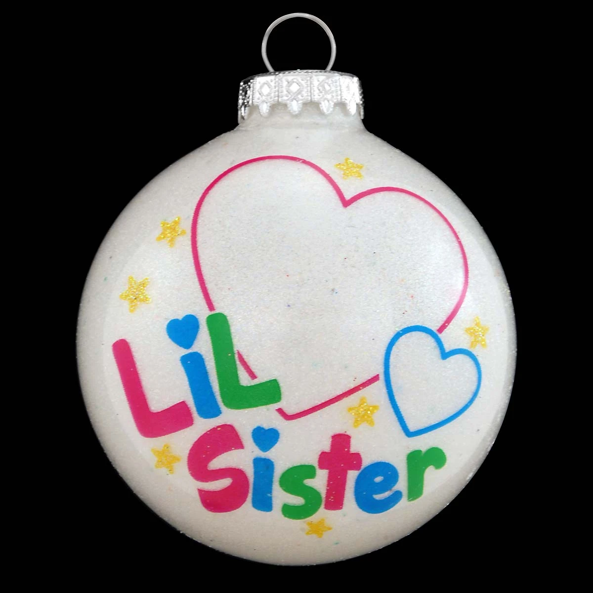 Honor her unique place in the family with this loving keepsake! Crafted of glass in Hungary exclusively for Bronner’s, our dazzling 3″ round white sparkle ornament features the words Lil Sister in vibrant hues of pink, turquoise, and green. Add a touch of her personal-ityâ„¢ when you allow one of our talented Bronner’s artists to place her name and year within the bright colored hearts with a magenta paint pen at no additional charge.