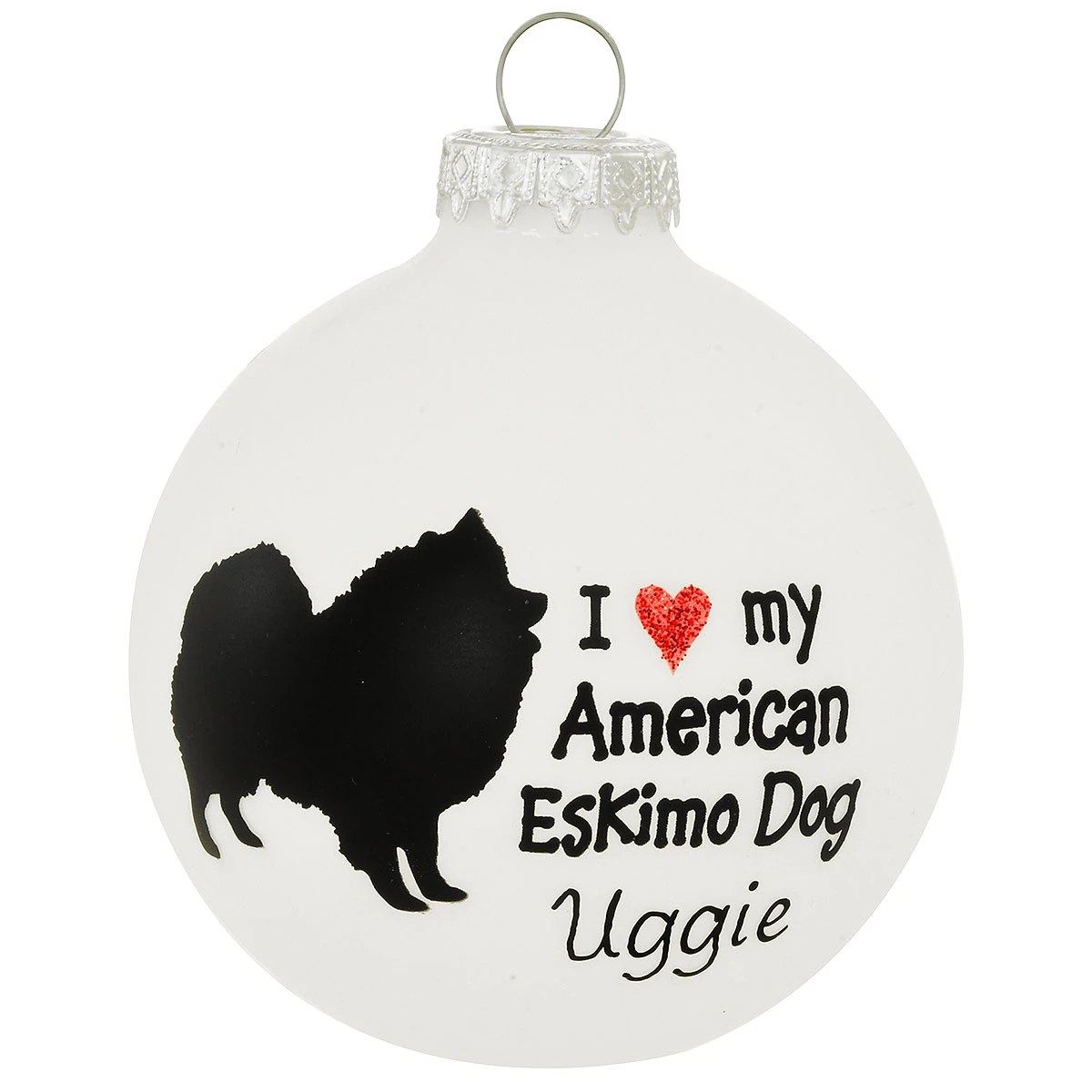 Our pets steal our heart but give us theirs; maybe that’s why it seems so easy for them to love us unconditionally! Crafted in Hungary from glass with a frosted white velvet finish, our Bronner’s exclusive 3″ tall I ♥ My Eskimo ornament celebrates the love and devotion you have for your faithful and furry friend!Â