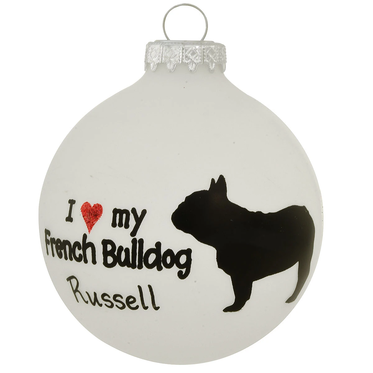 Our pets steal our heart but give us theirs; maybe that’s why it seems so easy for them to love us unconditionally! Crafted from glass in Hungary and measuring 3″ round, our Bronner’s exclusive “I ♥ My French Bulldog” ornament celebrates the love and devotion you have for your dog … a faithful and furry friend! Allow one of our professional Bronner’s artists to add a personal touch with a black paint pen at no additional charge to this keepsake ornament.