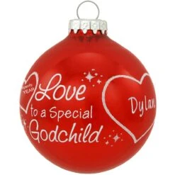 Your Godchild will cherish this this unique Christmas keepsake! Crafted of glass in Hungary exclusively for Bronner’s, our 3″ round ornament has a shiny red surface artfully decorated with a pair of hearts and the sentiment Love to a Special Godchild shimmering with accents of iridescent white glitter. Allow one of our professional Bronner’s artists to add a personalized touch with a white paint-pen at no additional charge for a gift your Godchild will cherish for years to come! Please select the alternate image for a view of this ornament without personalization.