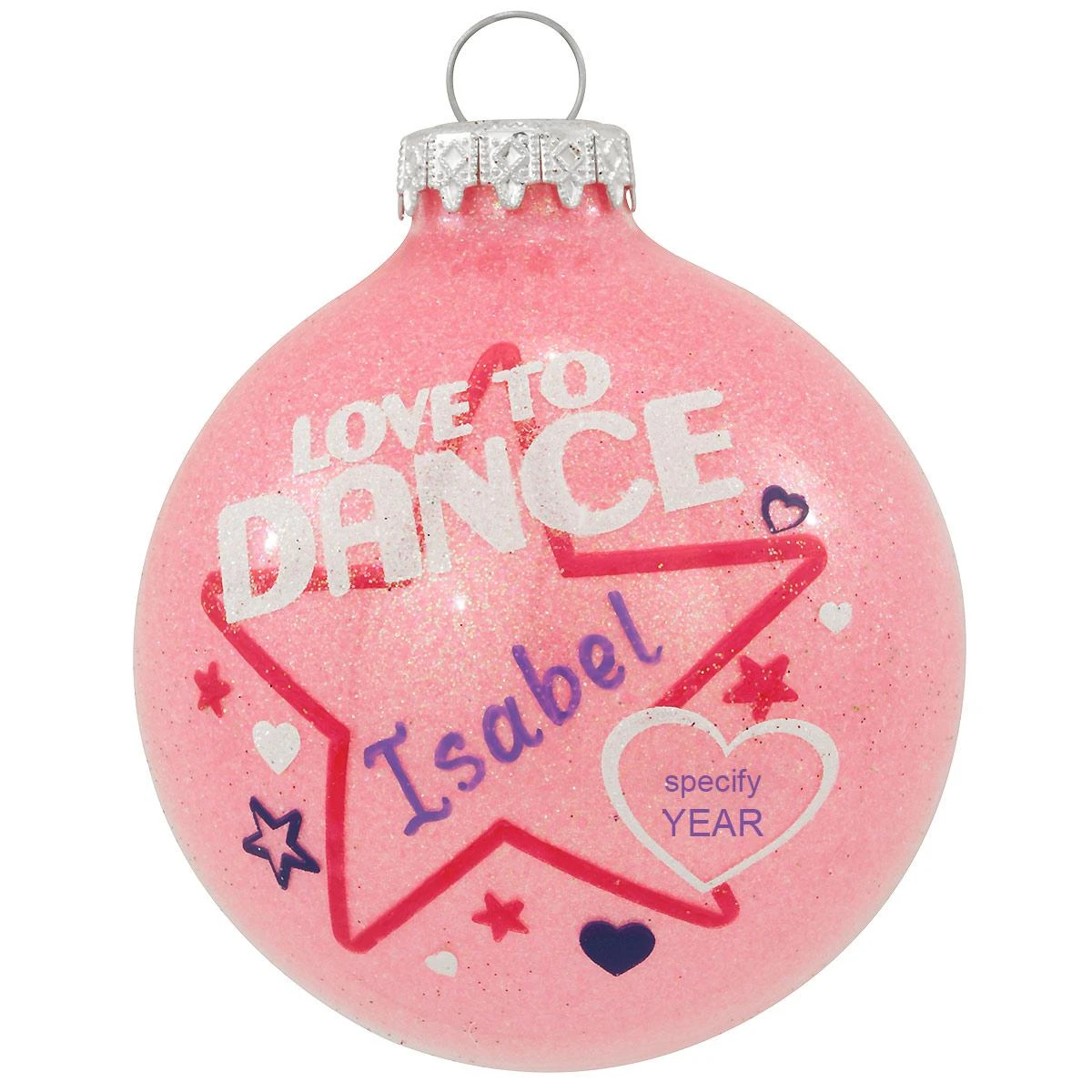 Know someone who loves to dance? Make her the star of the show with this dazzling pink sparkle ornament! Artfully crafted of glass in Hungary, our 3″ tall Bronner’s exclusive design features an interior coating of iridescent pink glitter that shimmers through the clear glass like an infinite number of stars. The words LOVE TO DANCE appear in iridescent white glitter above a vibrant star and heart motif perfect for personalizing with a special name and year. Allow one of our talented Bronner’s artists to add a touch of personal-ityâ„¢ with a purple paint pen at no additional charge.
