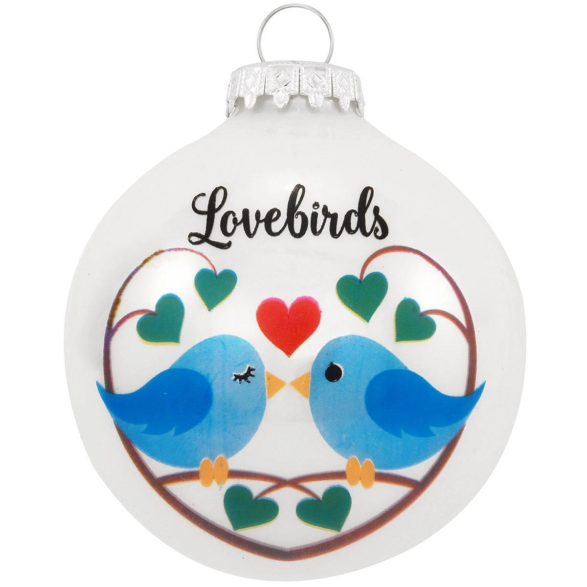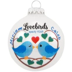 Surprise the happy couple you know with this adorable gift artfully crafted of glass exclusively for Bronner’s from Hungary! Featuring the sentiment Lovebirds, a pair of blue feathered friends are perched contentedly within a border of branches and heart shaped leaves. Perfect for Christmas as well as an engagement, a wedding, or an anniversary, this stunning 3″ tall white ornament can be personalized for your favorite “lovebirds” by one of our professional Bronner’s artists using a blue paint pen at no additional charge.