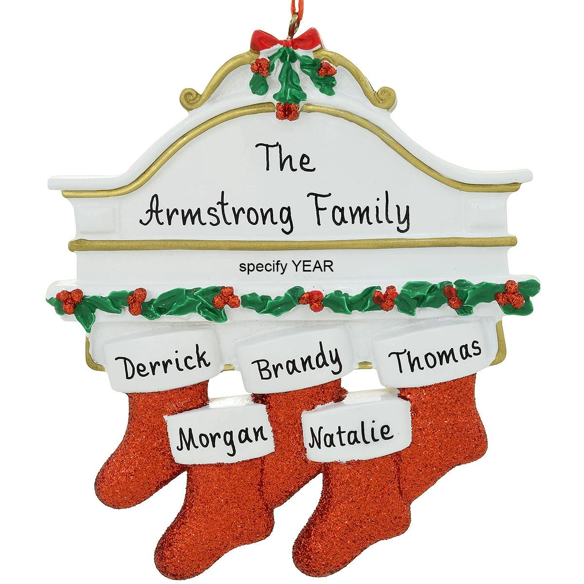 Please select the alternate image for a view of this personalized mantle with 5 stockings ornament without personalization.