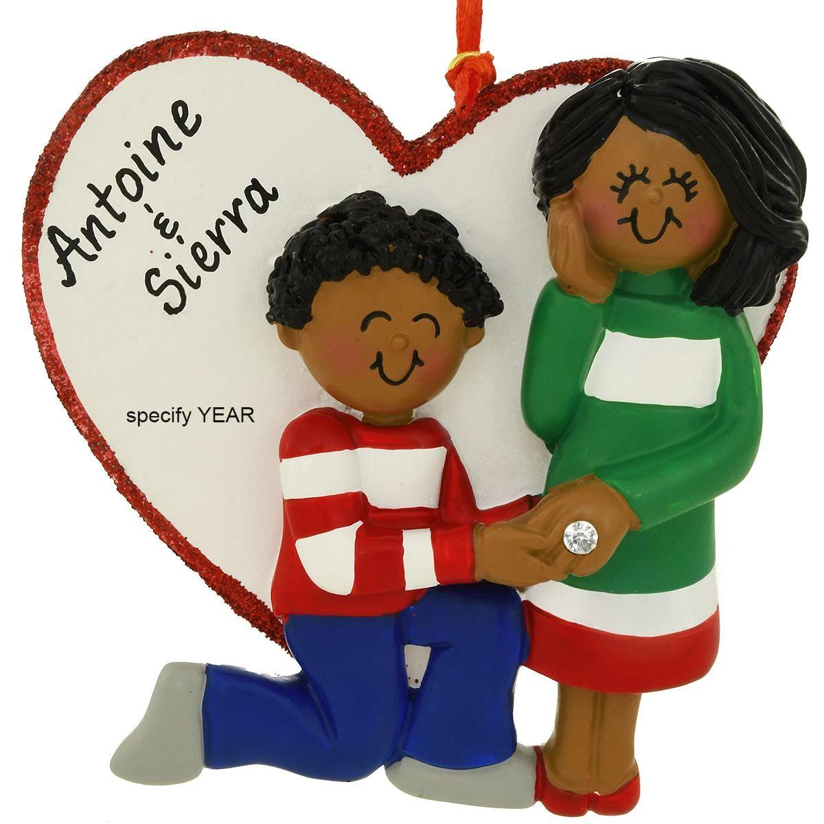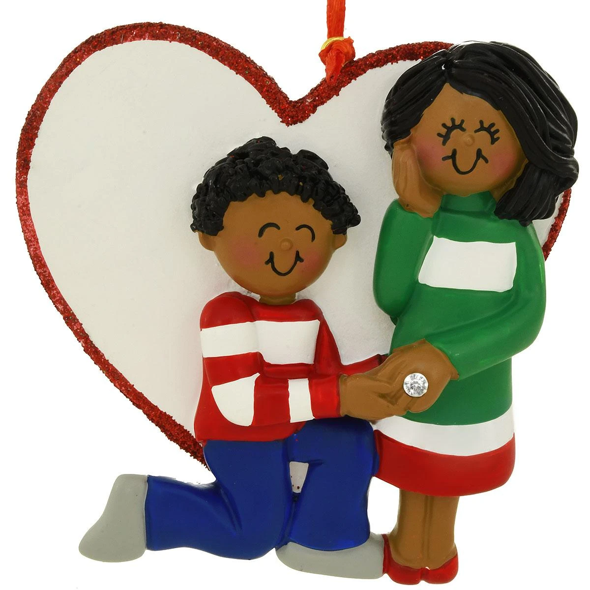 Commemorate the happy occasion when he proposed and she said “yes” with this heartwarming engagement keepsake! Crafted of resin, our marry me ornament depicts a joyful African American couple in the moment when he proposed on bended knee and she slipped the engagement ring on her finger. Adorned with vivid glazes, crystal gem accent, and a prominent heart edged in shimmering red glitter, this charming 3¼” tall ornament comes ready to hang with a red ribbon and makes a great gift for the happy couple engaged to be married and pledging a lifetime of love and devotion! For a truly exceptional gift, allow one of Bronner’s professional artists to add a touch of person-alityâ„¢ at no additional charge!Â