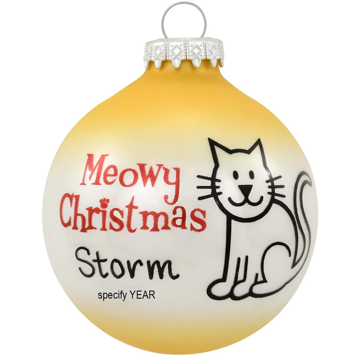 MEOWY Christmas to your special feline! Your fur-baby is sure to purr with delight to see an ornament personalized just for her hanging on the tree. Hand-crafted of glass in Hungary, this handsome Bronner’s exclusive ornament features a whimsical black outline of a cat with Meowy Christmas appearing in red. In 2-tone hues of white and yellow-gold, this 3″ round ornament has a shimmering opal surface and can be personalized by one of our talented Bronner’s artists with a black paint pen at no additional charge.