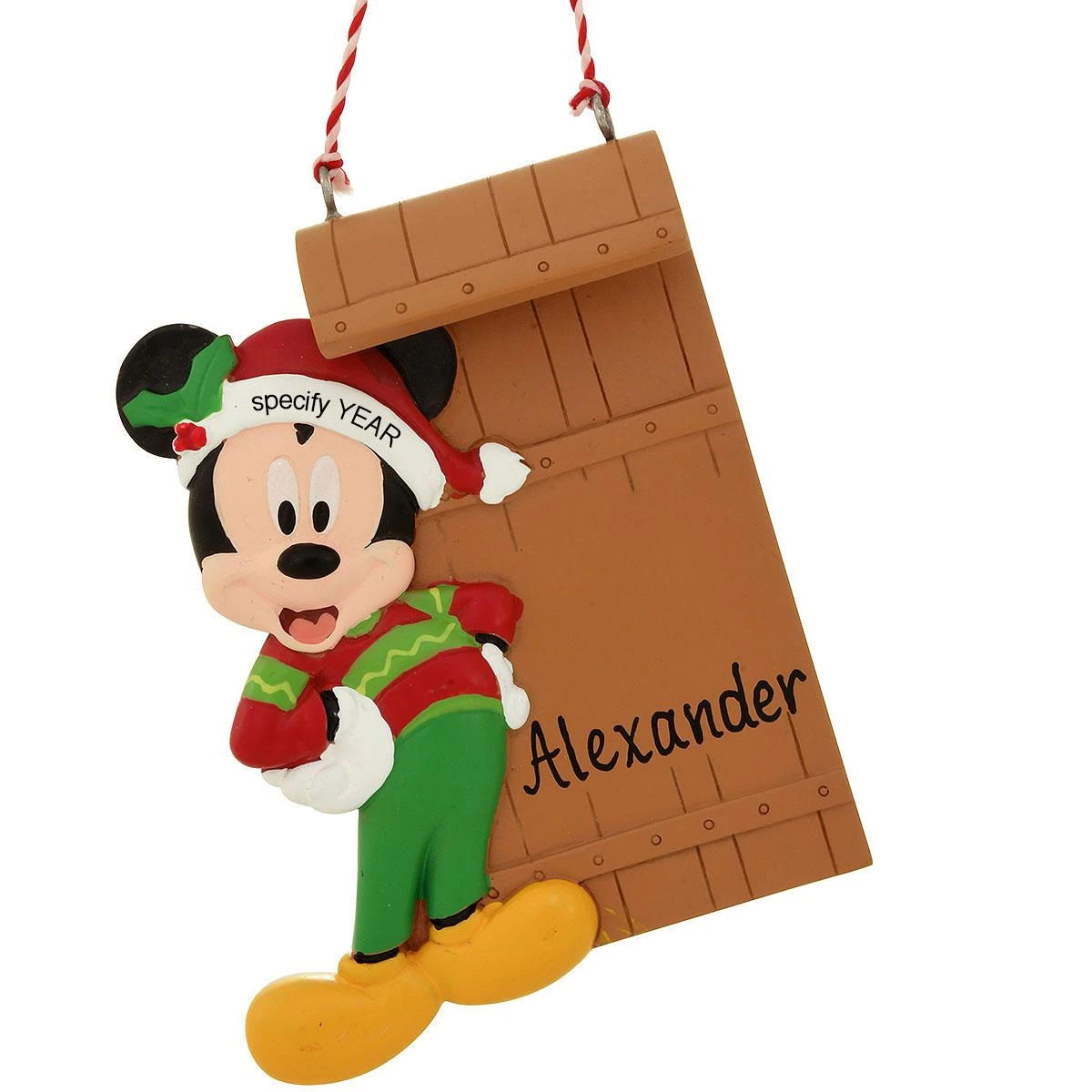 Add some festive fun to the holidays with this Christmas tree ornament featuring Mickey Mouse wearing a festive holiday sweater and Santa hat adorned with holly. The toboggan behind Mickey includes space for one of Bronner’s artists to add a touch of PERSONAL-ity® with black paint pen at no additional charge!