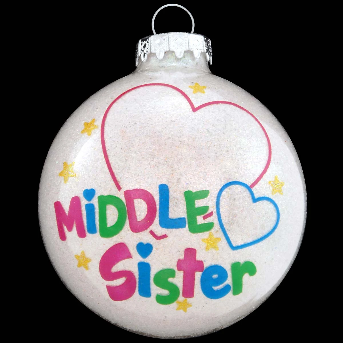 Honor her unique place in the family with this loving keepsake! Crafted of glass in Hungary exclusively for Bronner’s, our dazzling 3″ round white sparkle ornament features the words Middle Sister in vibrant hues of pink, turquoise, and green. Add a touch of personal-ity® when you allow one of our talented Bronner’s artists to place her name and year within the colorful hearts with a magenta paint pen at no additional charge.