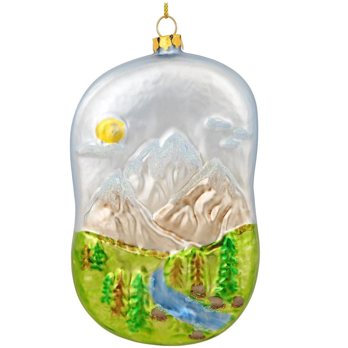 Relive that memorable hike, climb, or sightseeing trip with our gorgeous personalized mountain view ornament! Artfully crafted of glass with colorful glazes and shimmering glitter accents, this beautiful keepsake depicts a crystal clear stream meandering through a lush, green valley as majestic mountain peaks pierce the blue sky above. Coming ready to hang with a gold cord, this 4½” tall Bronner’s exclusive ornament can be personalized by one of our talented Bronner’s artists with a black paint pen at no additional charge.