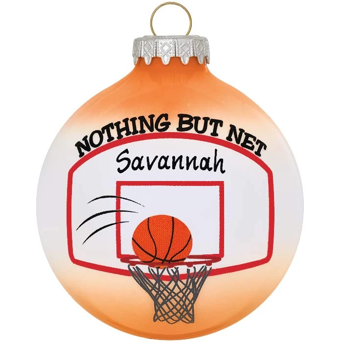 You’re sure to score a few points with the basketball player on your Christmas list when he or she sees this special gift! Expertly crafted in Hungary exclusively for Bronner’s, our 3″ round glass ornament has an attractive two-tone orange and white finish and depicts a basketball swish-ing through the net. With the words NOTHING BUT NET appearing above the backboard, this sport-ing keepsake can be personalized by one of our professional Bronner’s artists with a black paint pen at no additional charge.