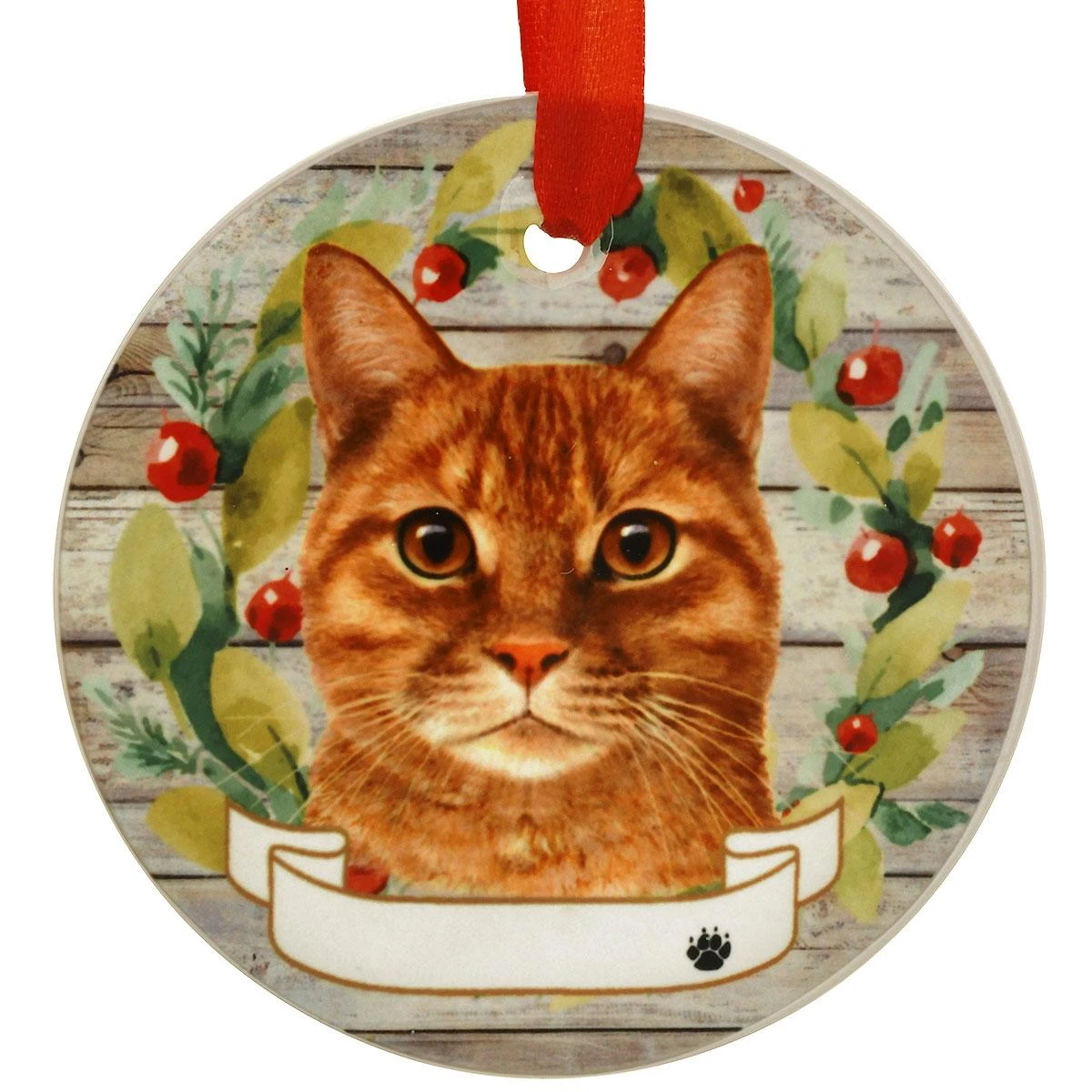 Celebrate the cat that’s part of the family circle! Our orange tabby cat round ceramic ornament features a portrait of an adorable feline framed within a festive wreath. Coming ready to display on a red ribbon, this 3½” ornament also makes a wonderful memorial of a special pet.