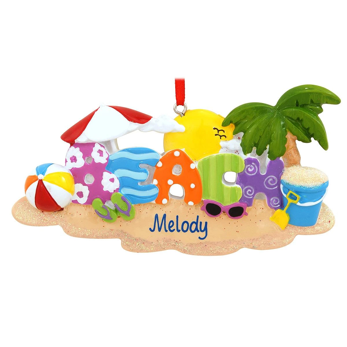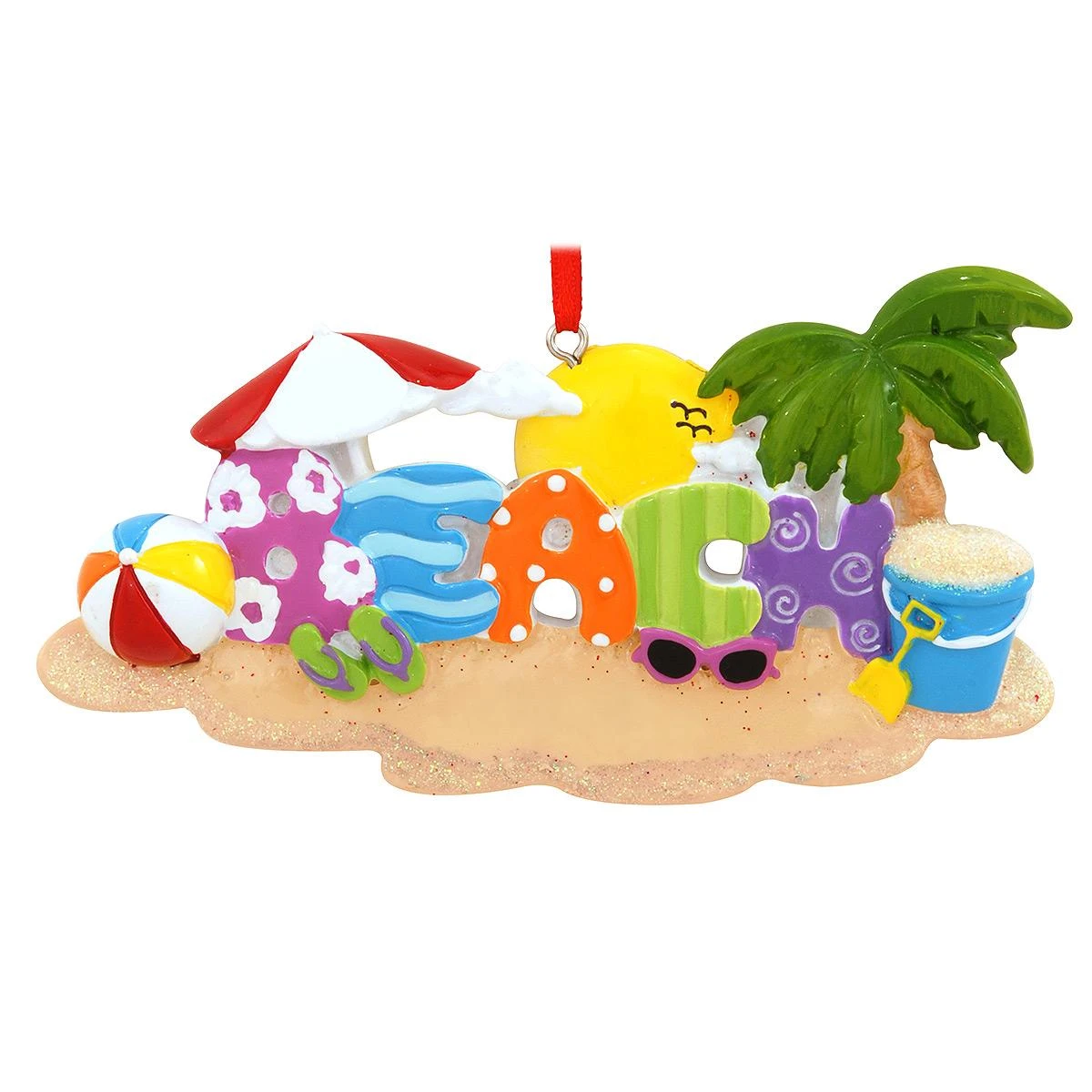 If your dream vacation includes fun-in-the-sun you’ll love this bright design! Colorfully crafted of resin with sparkling glitter accents, this 2″ x 4¾” tall ornament features the word BEACH along with a sand pail, beach ball, palm tree and umbrella. Coming ready to hang with a red ribbon, this vibrant design can be personalized by one of our talented Bronner’s artists with a blue paint pen at no additional charge.