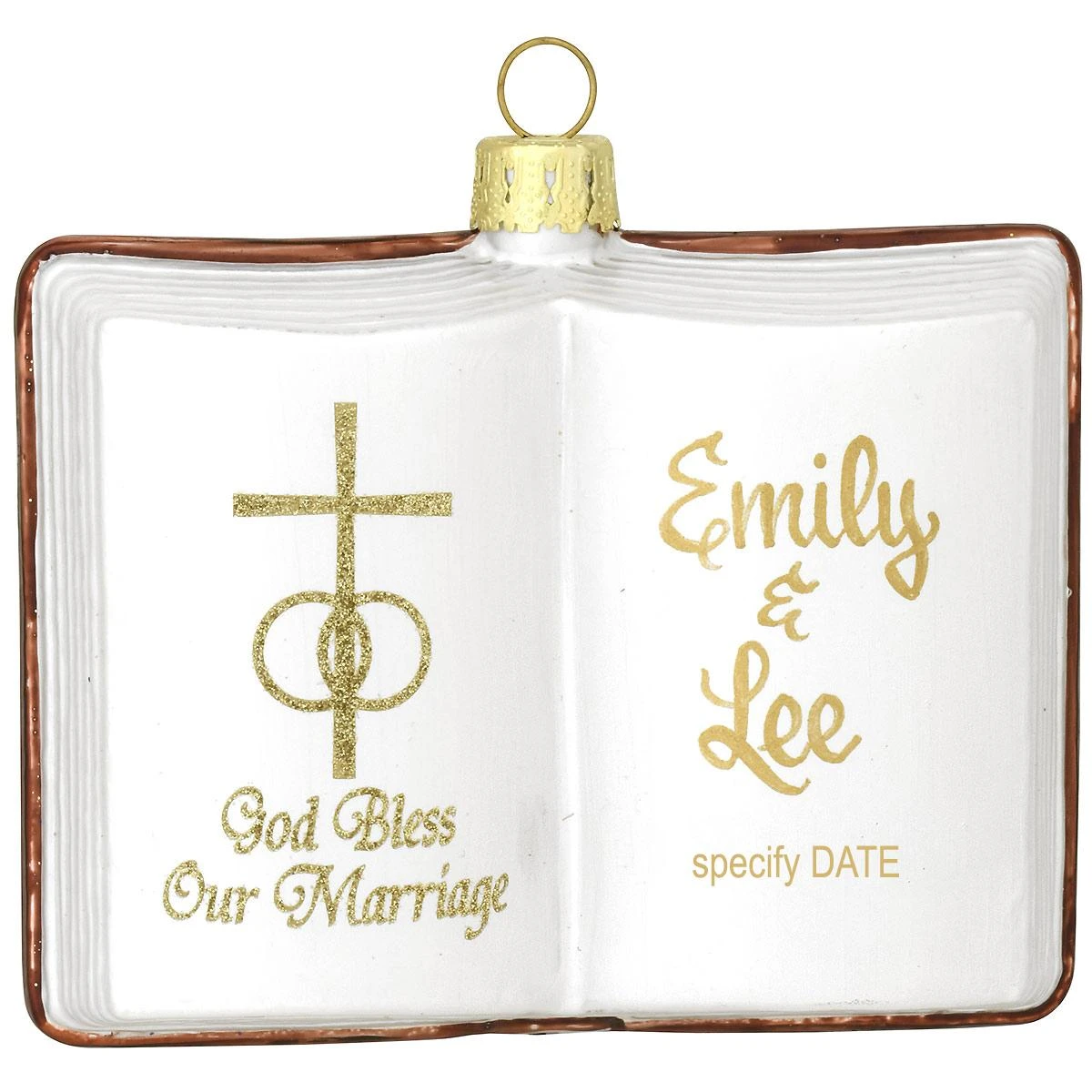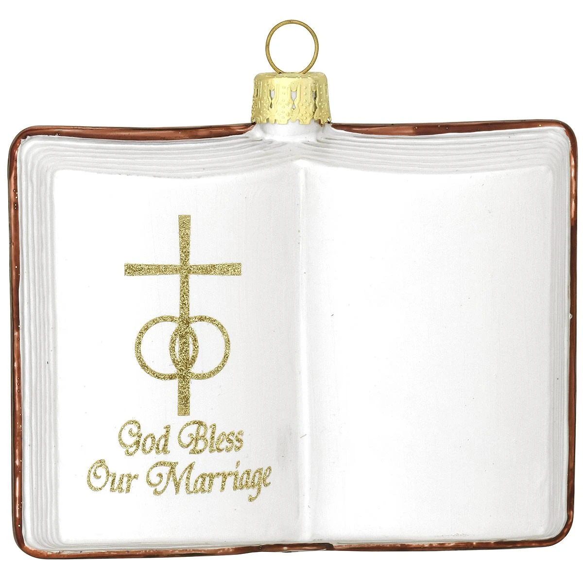 Need a special gift for a happy couple heading to the altar? Accented with a gold glitter cross and wedding rings design, this beautiful open Bible ornament features the sentiment God Bless Our Marriage. Artfully crafted of glass exclusively for Bronner’s, this charming our marriage bible ornament measures 3″ tall x 3½” wide and comes ready to hang with a gold cord. The reverse side has a shiny copper finish adorned with a sparkling gold cross. Allow one of our talented Bronner’s artists to hand-paint a personalized touch in glistening gold paint at no additional charge.