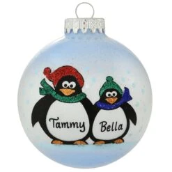 This cool keepsake is especially designed for the family with one parent and child. Picturing an adult penguin and a chick all bundled up in colorful hats and scarves, this unique Bronner’s exclusive ornament is artfully crafted in Hungary and positively shimmers with an interior coating of glitter that shines through the ice-blue and clear glass surface creating a delightfully frosty atmo-sphere. This charming 4″ tall penguin parent and child sparkle ornament can be personalized for by one of our professional Bronner’s artists with a black paint pen at no additional charge.