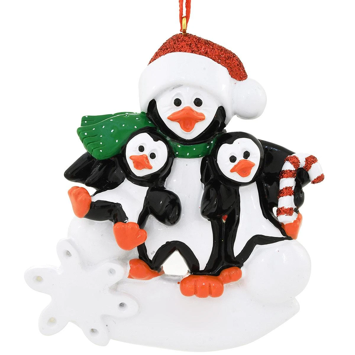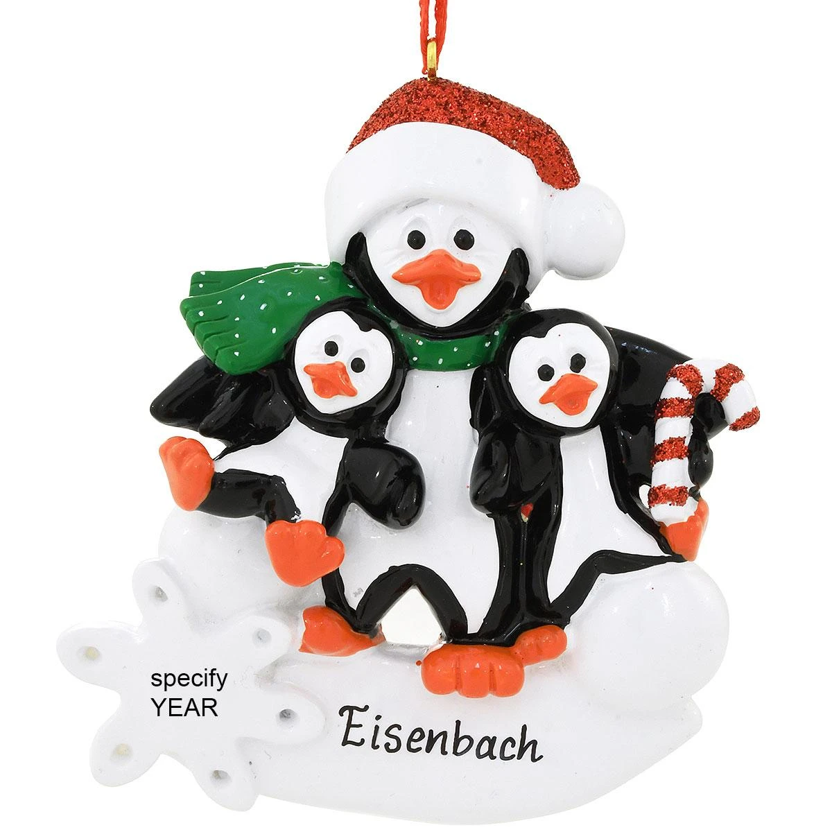 Two little penguins are having snow much fun just chillin’ out with Mom or Dad! Colorfully crafted in resin, our penguin with 2 children ornament depicts an adult penguin, in a festive green scarf and Santa hat, snuggling up with two “chicks” balancing atop snowballs. Accented with a candy cane, snowflake and touches of sparkling red glitter, this whimsical 3¾” tall keepsake comes ready to hang with a red ribbon. For a unique gift with personal-ityâ„¢, why not allow one of our professional Bronner’s artists to personalize this keepsake for your special family using a black paint pen at no additional charge?