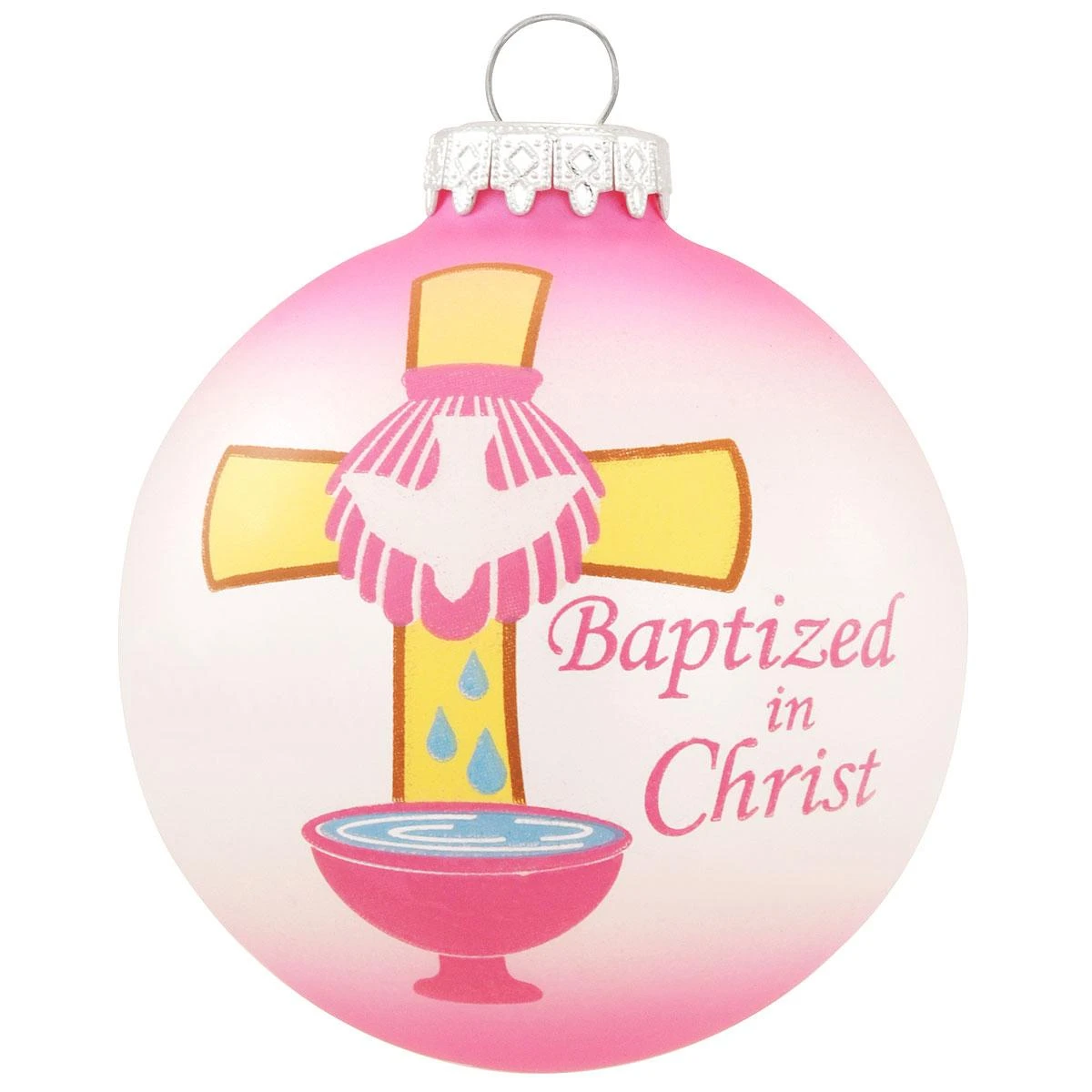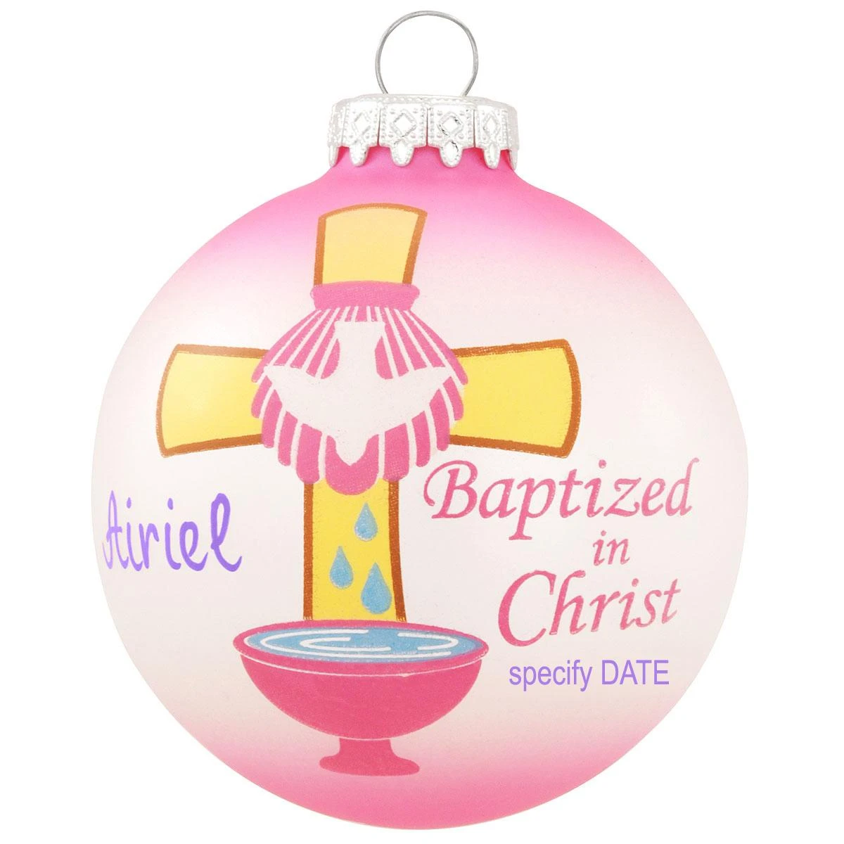 Rejoice in the sacred occasion of a special girl’s christening with this unique 3″ ornament. Artfully crafted of glass in Hungary exclusively for Bronner’s, this distinctive ornament features a pink color scheme with a depiction of a cross, dove, and baptismal sentiment that reads Baptized in Christ. A perfect gift for your daughter’s, granddaughter’s, or Goddaughter’s baptism, our pink baptized in Christ with Cross ornament is sure to become a treasured keepsake for years to come when you allow one of our talented Bronner’s artists to add a personalized touch with a purple paint pen at no additional charge.