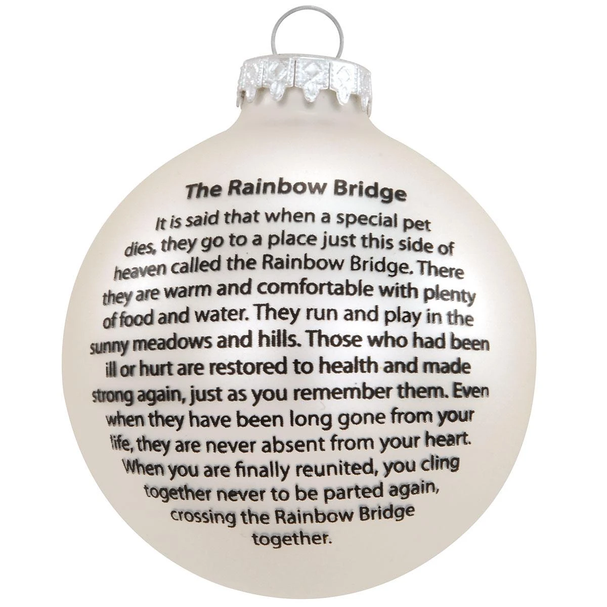 Remember a special pet who, though gone from your life, is never absent from your heart. Our personalized rainbow bridge pet remembrance ornament is artfully crafted of glass from Hungary and features a trail of paw prints next to a colorful rainbow along with the words …waiting at the Rainbow Bridge. Printed on the reverse side of this Bronner’s exclusive 3″ tall keepsake is a sunny vision of pet life at the rainbow bridge where there’s plenty of food and water and sunny meadows to romp and play. Allow one of our talented Bronner’s artists to add a personalized touch with a black paint pen at no additional charge.