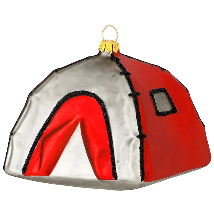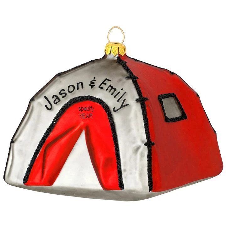 The campers on your list will be excited to pitch this pop-up tent in their Christmas tree this year! Crafted of glass exclusively for Bronner’s with sparkling black glitter accents, our 3″ tall personalized pop-up tent ornament is sporting red and gray sides with black trim. Allow one of our professional Bronner’s artists to add a personal touch with a black paint pen at no additional charge.