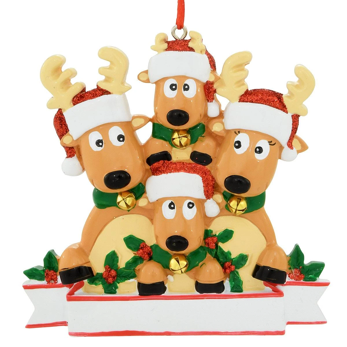 Make room on the family tree for this deer design! Portraying four reindeer with antlers and Santa hats wearing collars adorned with gold jingle bells, our adorable reindeer family of 4 ornament is colorfully crafted of resin and measures 3¾” tall x 3¾” wide. With dazzling red glitter and a festive holly and berry motif, this cute keepsake comes ready to hang with a red ribbon and can be personalized by one of our talented Bronner’s artists with a black paint pen at no additional charge.