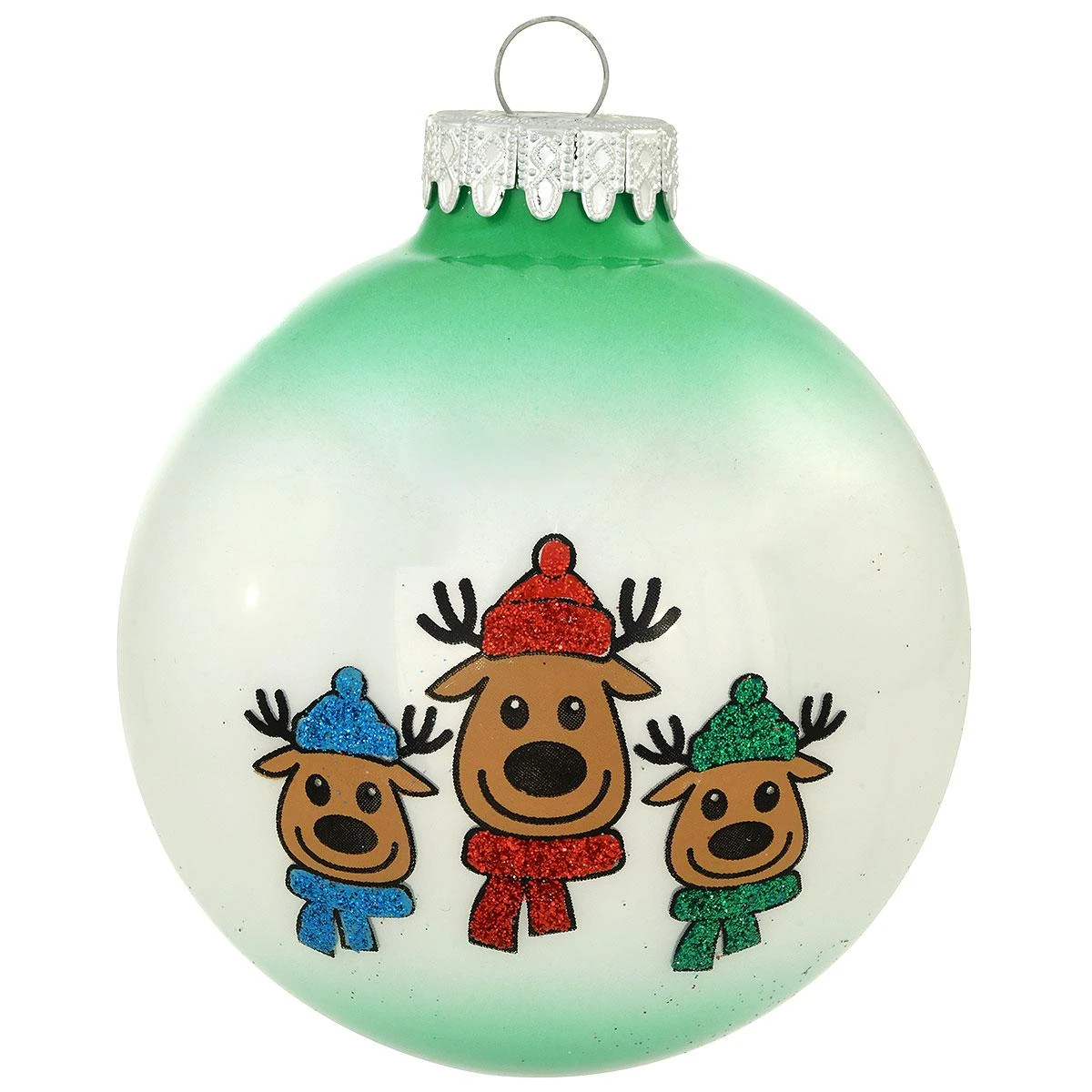 Is your family filled with “sparkling personalities”? Custom made for your special “herd”, this colorful keepsake features a smiling reindeer parent and 2 kids all bundled up in glittering hats and scarves of blue, red and green. Crafted of glass in Hungary exclusively for Bronner’s, this adorable ornament features a bright 2-tone green and white surface and measures 4″ round. Why not have this special family keepsake personalized by one of our talented Bronner’s artists with a black paint pen at no additional charge?