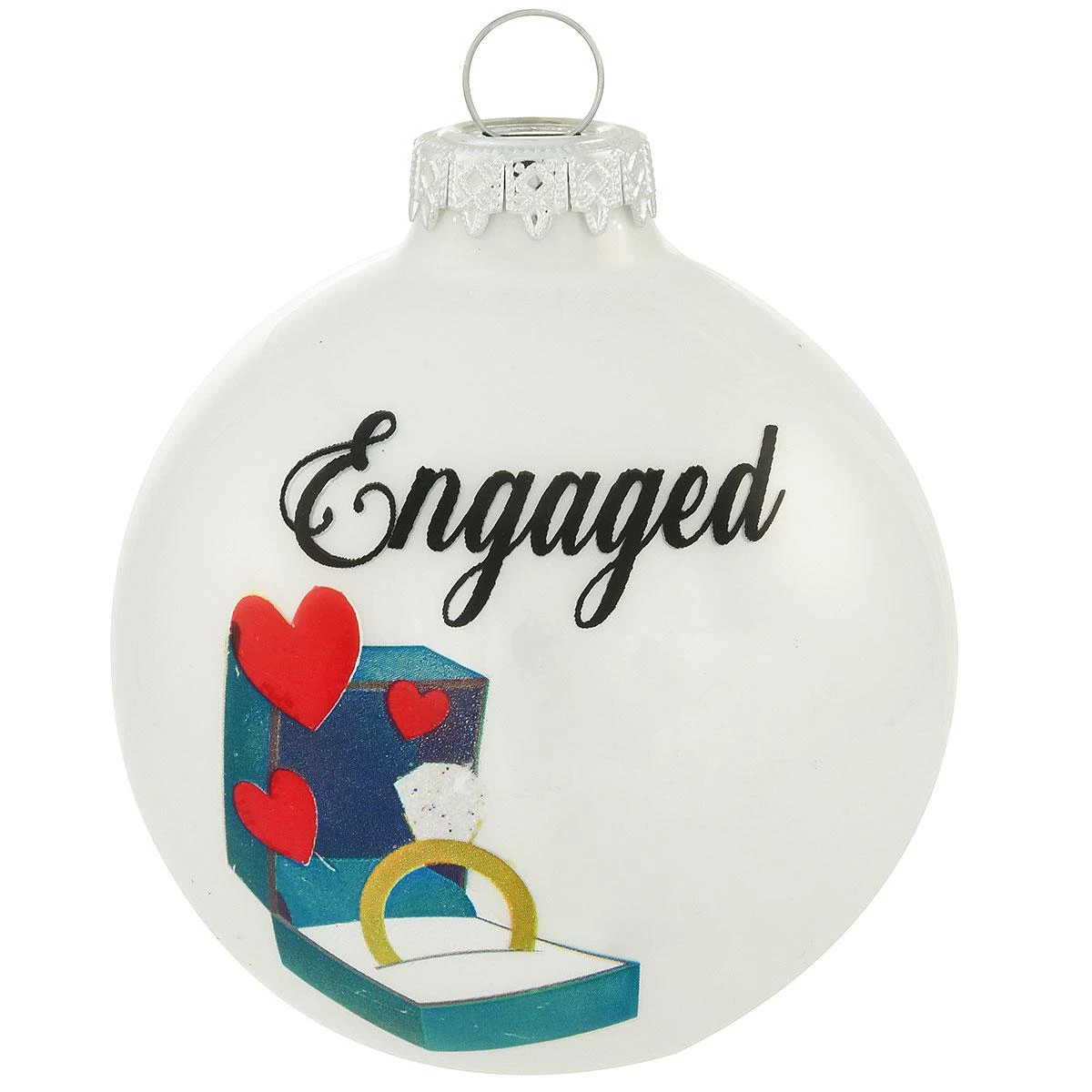 You’re getting married! Celebrate the exciting occasion with a unique keepsake that has a nice ring to it, engaged! Crafted of glass exclusively for Bronner’s from Hungary, our 3″ white opal ornament depicts a sparkling diamond band in a vivid turquoise ring box surrounded by hearts and the elegantly scripted sentiment “Engaged.” A fitting memento for the future bride and groom, this charming keepsake can be personalized for the soon to be Mr. and Mrs. at no additional charge when you allow one of our talented Bronner’s artists to hand-paint a touch of their personal-ity in glossy, black paint.
