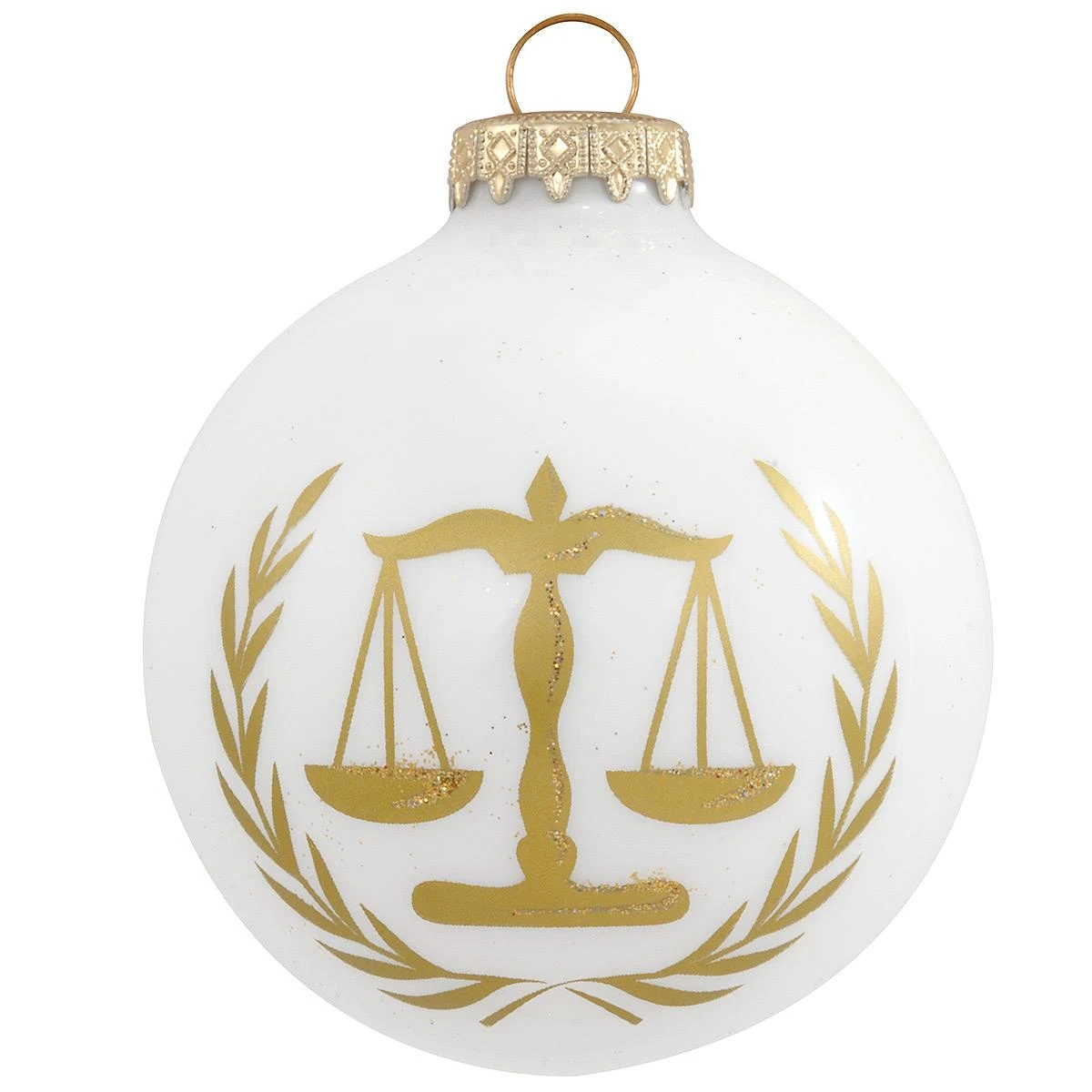 Perfect for the attorney, law student, or paralegal on your Christmas list, this shimmering white ornament features a gold image of the symbolic Scales of Justice accented with sparkling glitter. Artfully crafted of glass in Hungary exclusively for Bronner’s, this 3″ round keepsake can be personalized by one of our talented Bronner’s artists using a gold paint pen at no additional charge.