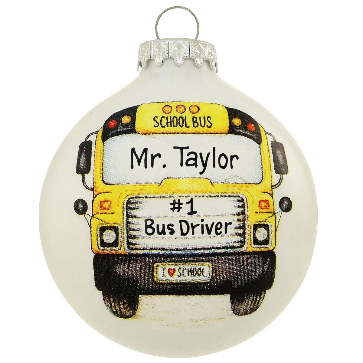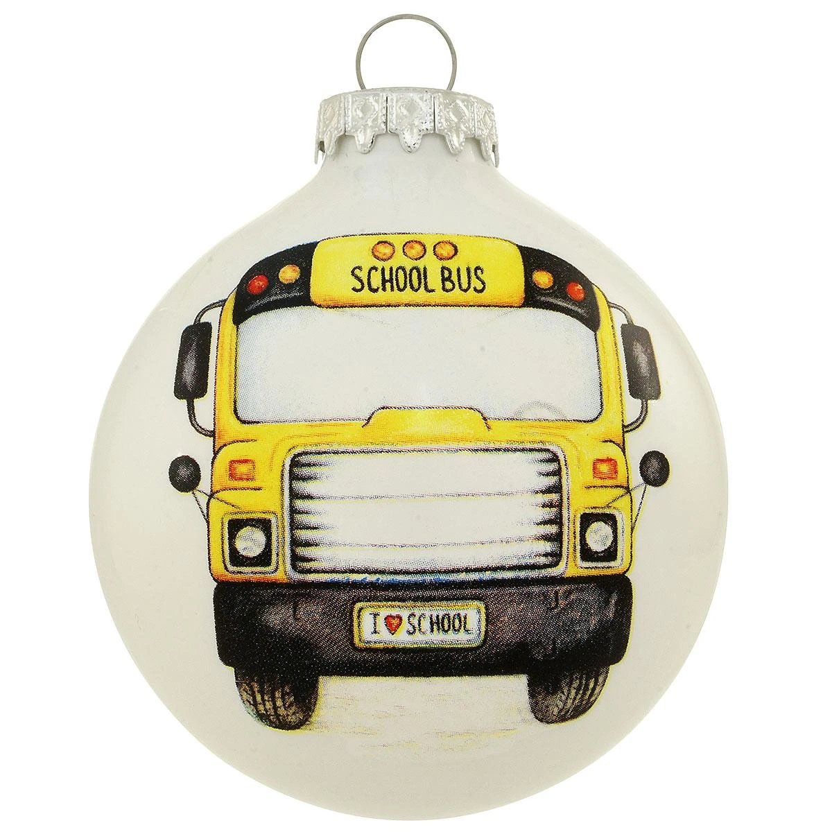 Remember your little one’s first day of school, a favorite bus driver, or fun school trip with this unique personalized ornament. Glass ornament with white enamel surface depicts a bright yellow school bus with “I ♥ School” license plate. 3″ Bronner’s exclusive ornament is crafted in Hungary.