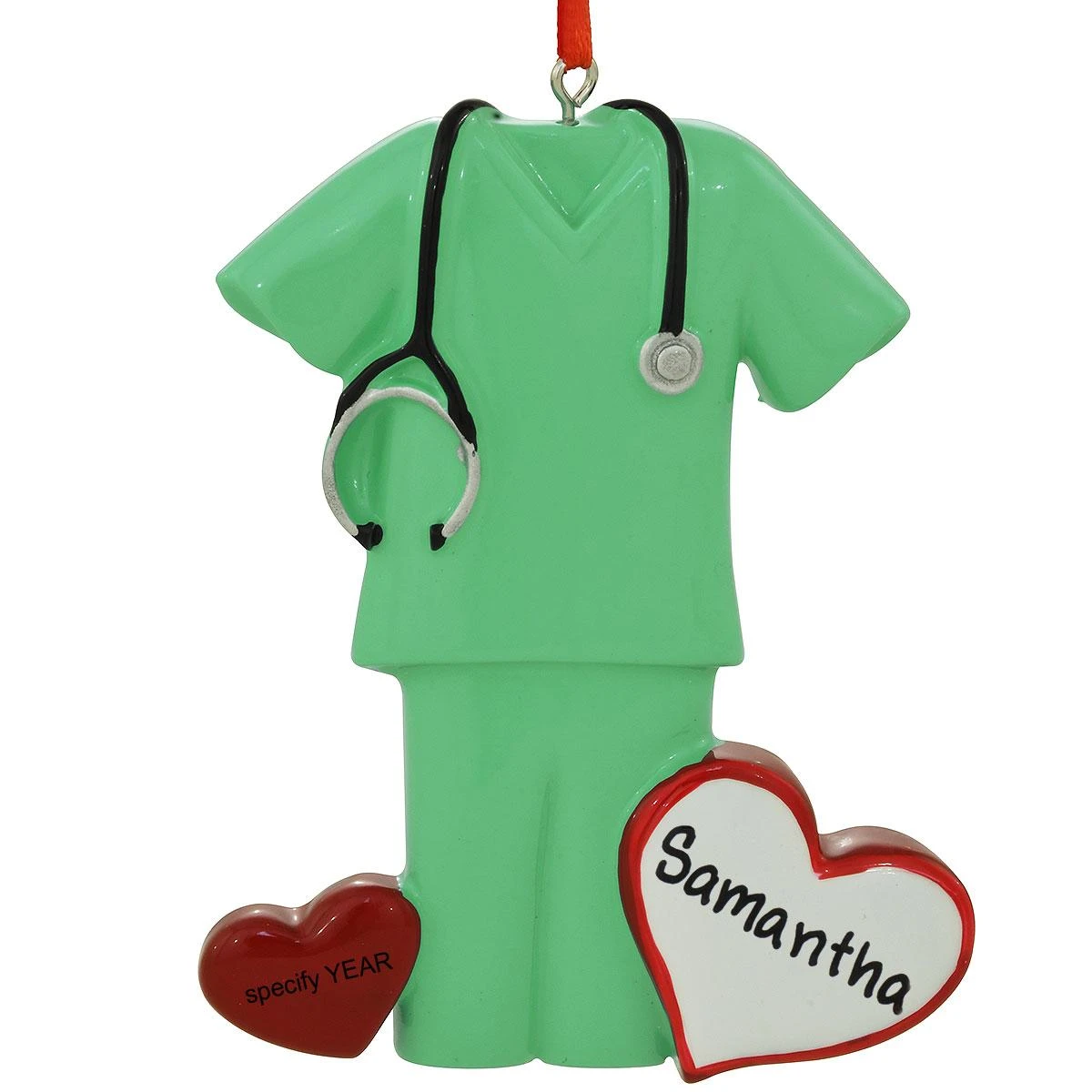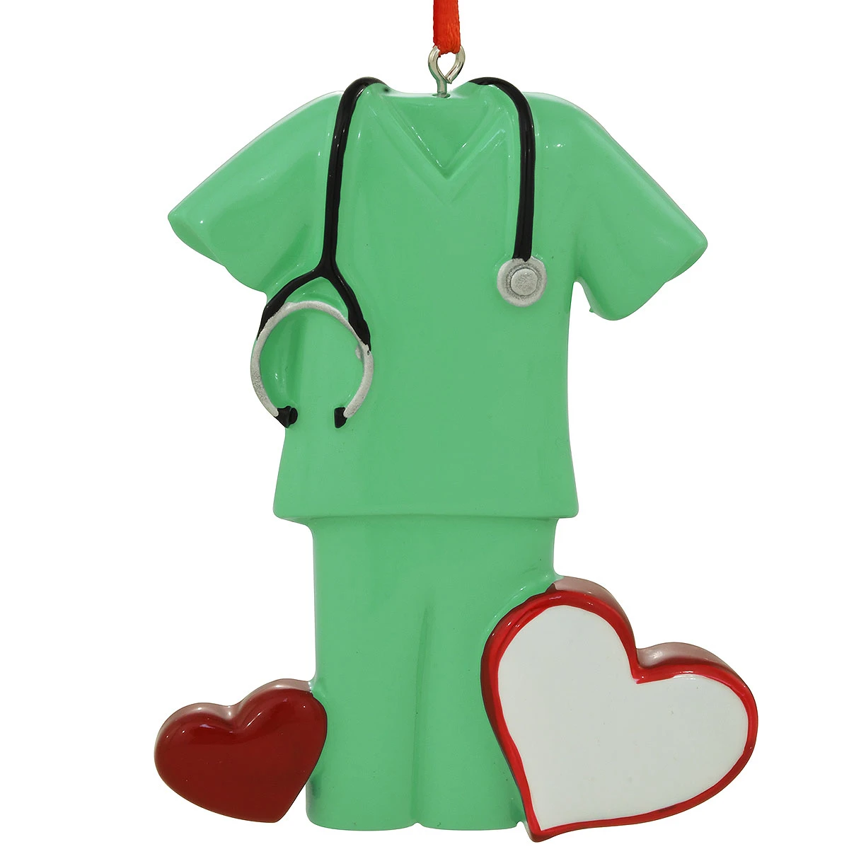 Now more than ever, we truly appreciate our frontline health care workers! A great “thank you” gift for doctors, nurses, and other dedicated medical professionals, our scrubs uniform resin ornament depicts a pair of green pants and shirt along with a stethoscope and two hearts. Ornament measures approximately 3½” tall and comes ready to hang on a red ribbon. For a personalized gift that’s sure to “fit” their tree, why not allow one of our talented Bronner’s artists to add a touch of personal-ityâ„¢ with a black paint pen at no additional charge?Â