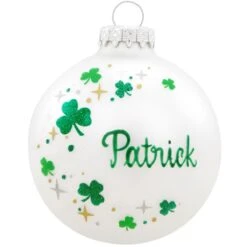 Good health, good luck, and happiness are wished for the recipient of this unique ornament! Artfully crafted of glass in Hungary exclusively for Bronner’s in a soft white finish with accents of sparkling emerald glitter, our 3″ tall shamrock swirl ornament shines brightly with a lovely mixture of glistening clover and star shapes in a sideways horseshoe shape. Allow one of our professional Bronner’s artists to hand-paint a personalized touch in vibrant green paint at no additional charge on this special keepsake for that lucky one.