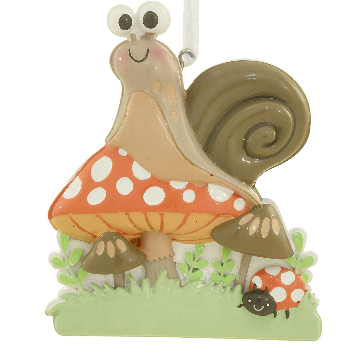When you’re waiting for Santa….Christmas seems to come at a snail’s pace! A snail is depicted perched on a mushroom with baby mushrooms and ladybug beneath. Adorned with colorful accents, resin ornament measures 3¾” tall and comes ready to hang on a white ribbon.Â