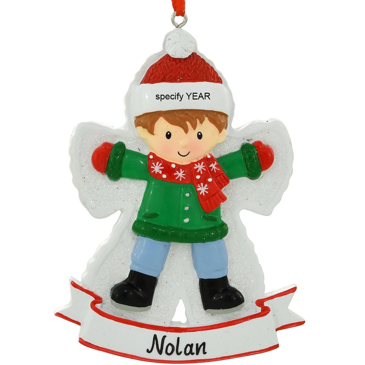 Look, mom, I’m making a snow angel! Lying face up in a fresh blanket of snow, an adorable little boy moves his arms up and down to make an angelic impression. Shimmering with glistening “snow”, our enchanting design is skillfully crafted of resin with hand-painted accents and comes ready to hang with a red ribbon. Why not allow one of our professional Bronner’s artists to add a personalized touch with a black paint pen to this adorable 3¾” tall snow angel boy ornament at no additional charge?