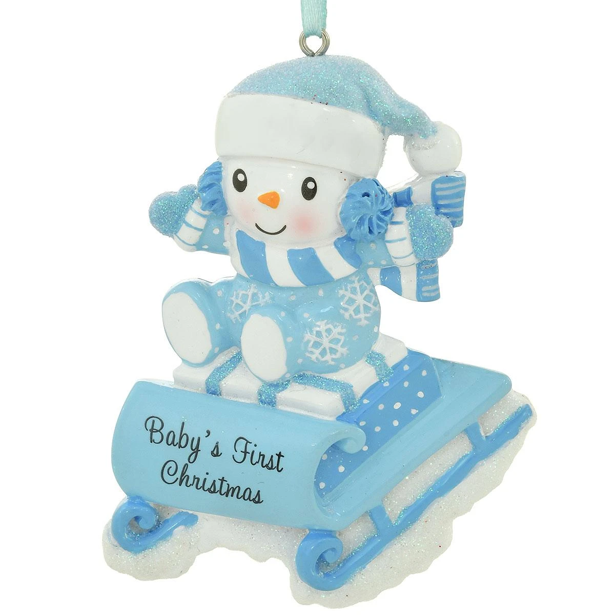 Sledding is a little like baby’s first year—there are plenty of thrills and sometimes some spills, but the journey is definitely worth it! Bumping downhill on a sled loaded with gifts, our adorable “snow baby” is all bundled up in a sparkling blue Santa hat and snowsuit patterned with snowflakes—and who can resist his sunny smile and cute carrot nose? Adorned with the sentiment Baby’s First Christmas and accents of iridescent glitter, this charming 3¼” tall snow baby on blue sled ornament is artfully crafted of resin and comes ready to hang with a light blue ribbon. A fun keepsake for the precious new little boy in your life, this heartwarming ornament can be personalized by one of our talented Bronner’s artists at no additional charge.